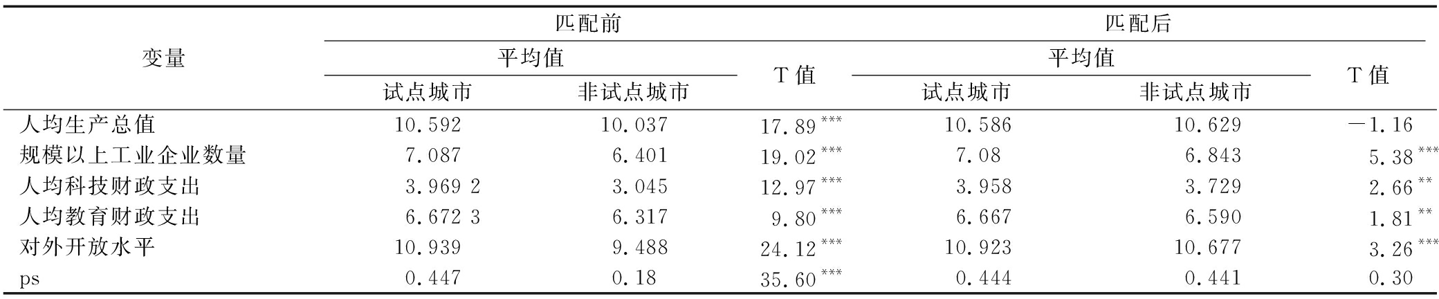 在选取合适的匹配变量后,本文对匹配效果进行检验,即对试点城市与非试点城市在匹配前后进行T检验,表5为T检验结果。匹配前,创新型城市试点与非试点均在0.05的置信水平下差异显著,说明两个组别之间的匹配变量差异较大,有可能产生统计上的样本选择偏差。匹配后,相较于匹配前,各匹配变量的T值显著性有所下降,且非试点城市变量均值有所上升,与试点城市之间差距缩小,说明匹配方法有效缩小了试点城市与非试点城市之间的选择偏差。