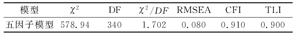 本研究采用的量表均为成熟量表,因而不再进行探索性因子分析,只对模型进行验证性因子分析,结果如表2所示。五因子模型几个常用拟合优度指标的参数拟合结果均较好:卡方统计量与自由度之比χ2/DF=1.702(<3),近似误差的平方根RMSEA=0.080(<0.08),同时,TLI、CFI等几个主要参数都大于0.9。因此,本研究量表的五因子模型得到验证。