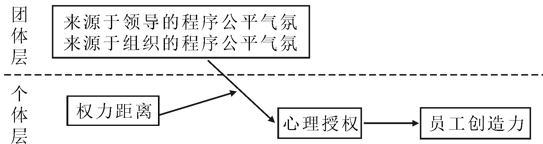 综上所述,本研究将基于动机理论,探讨多源程序公平气氛(来源于领导的程序公平气氛和来源于组织的程序公平气氛)对个体创造力的跨层次影响及作用机理,并进一步分析心理授权在其中发挥的中介作用,以及权力距离对多源程序公平气氛和心理授权的调节作用,深入揭示多源程序公平气氛对个体创造力的作用机理。