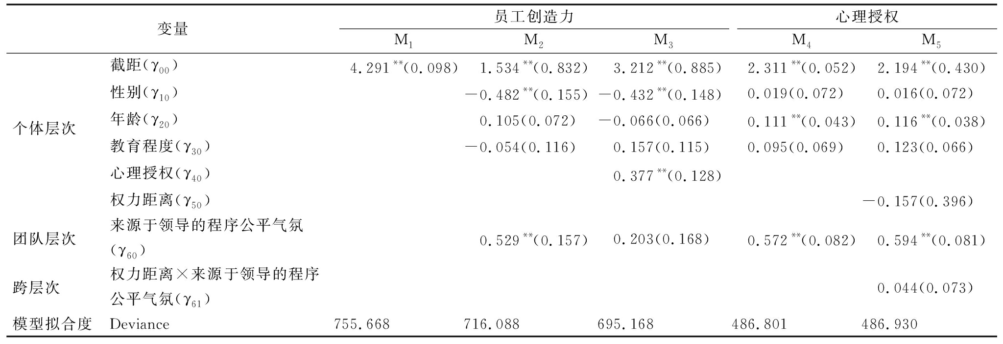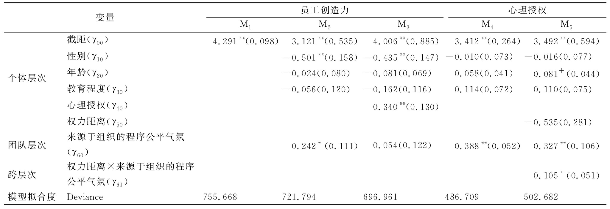 变量员工创造力M1M2M3心理授权M4M5个体层次截距(γ00)4.291**(0.098)1.534**(0.832)3.212**(0.885)2.311**(0.052)2.194**(0.430)性别(γ10)-0.482** (0.155)-0.432**(0.148)0.019(0.072)0.016(0.072)年龄(γ20)0.105(0.072)-0.066(0.066)0.111**(0.043)0.116**(0.038)教育程度(γ30)-0.054(0.116)0.157(0.115)0.095(0.069)0.123(0.066)心理授权(γ40)0.377**(0.128)权力距离(γ50)-0.157(0.396)团队层次来源于领导的程序公平气氛(γ60)0.529**(0.157)0.203(0.168)0.572**(0.082)0.594**(0.081)跨层次权力距离×来源于领导的程序公平气氛(γ61)0.044(0.073)模型拟合度Deviance755.668716.088695.168486.801486.930