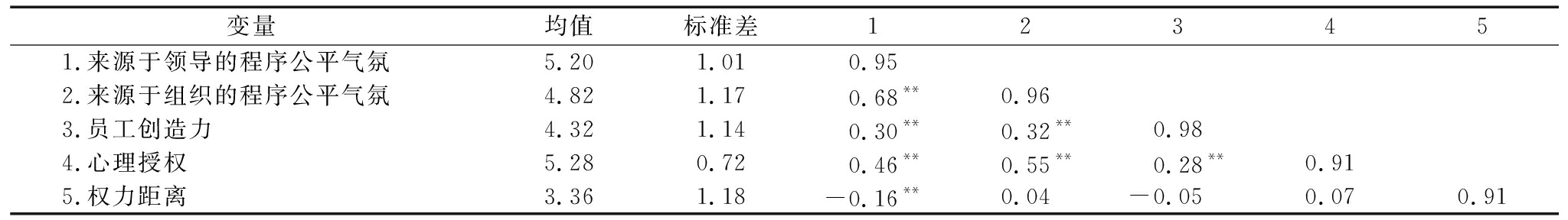 变量均值标准差123451.来源于领导的程序公平气氛5.201.010.952.来源于组织的程序公平气氛4.821.170.68**0.963.员工创造力4.321.140.30**0.32**0.984.心理授权5.280.720.46**0.55**0.28**0.915.权力距离3.361.18-0.16**0.04-0.050.070.91