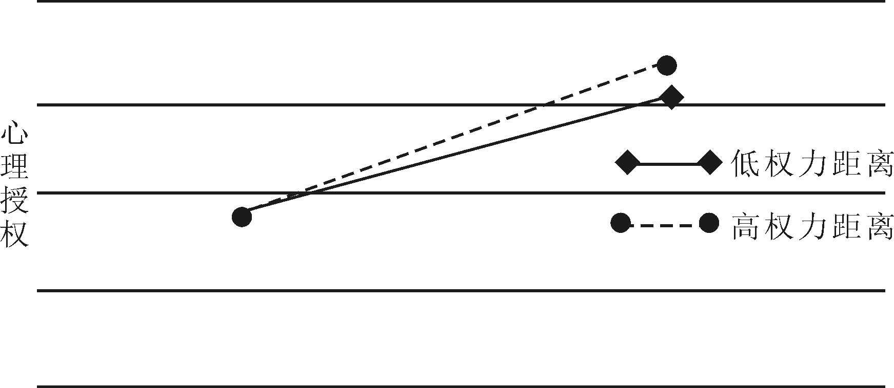根据员工在个人权力距离上的得分,本研究将其分成3种类型即高权力距离、中权力距离、低权力距离,并分别画出高权力距离和低权力距离两种情况下,来源于组织的程序公平气氛与心理授权间关系,如图2所示。与假设相吻合,对于权力距离较高的员工,来源于组织的程序公平气氛与心理授权之间的关系更显著。