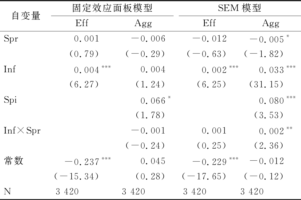 自变量固定效应面板模型EffAggSEM模型EffAggSpr0.001-0.006-0.012-0.005* (0.79)(-0.29)(-0.63)(-1.82)Inf0.004***0.0040.002***0.033*** (6.27)(1.24)(6.25)(31.15)Spi0.066*0.080*** (1.78)(3.53)Inf×Spr -0.0010.0010.002** (-0.24)(0.25)(2.36)常数-0.237***0.045-0.229***-0.012 (-15.34)(0.28)(-17.65)(-0.12)N3 420 3 420 3 420 3 420
