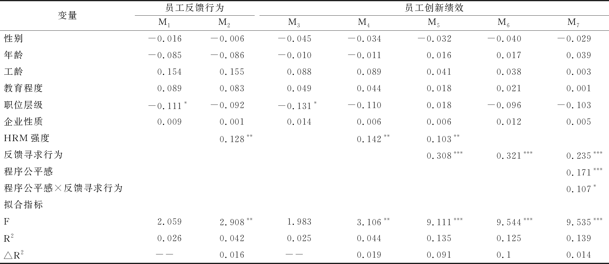 模型中所有变量的均值、标准差和相关系数如表3所示,HRM强度与员工创新绩效正相关(r=0.160,且p<0.01);HRM强度与员工反馈寻求行为正相关(r=0.144,且p<0.01)。假设H1得到初步验证。接下来,采用层次回归分析进一步检验研究假设。