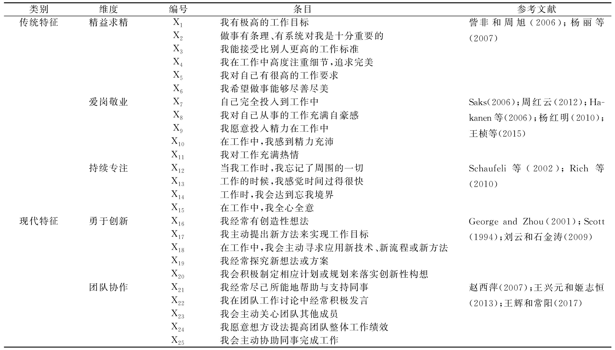 类别维度编号条目 参考文献传统特征精益求精X1我有极高的工作目标訾非和周旭(2006);杨丽等(2007)X2做事有条理、有系统对我是十分重要的X3我能接受比别人更高的工作标准X4我在工作中高度注重细节,追求完美X5我对自己有很高的工作要求X6我希望做事能够尽善尽美爱岗敬业X7自己完全投入到工作中Saks(2006);周红云(2012);Ha-kanen等(2006);杨红明(2010);王桢等(2015)X8我对自己从事的工作充满自豪感X9我愿意投入精力在工作中X10在工作中,我感到精力充沛X11我对工作充满热情持续专注X12当我工作时,我忘记了周围的一切Schaufeli等(2002);Rich等(2010)X13工作的时候,我感觉时间过得很快X14工作时,我会达到忘我境界X15在工作中,我全心全意现代特征勇于创新X16我经常有创造性想法George and Zhou(2001);Scott(1994);刘云和石金涛(2009)X17我主动提出新方法来实现工作目标X18在工作中,我会主动寻求应用新技术、新流程或新方法X19我经常探究新想法或方案X20我会积极制定相应计划或规划来落实创新性构想团队协作X21我经常尽己所能地帮助与支持同事赵西萍(2007);王兴元和姬志恒(2013);王辉和常阳(2017)X22我在团队工作讨论中经常积极发言X23我会主动关心团队其他成员X24我愿意想方设法提高团队整体工作绩效X25我会主动协助同事完成工作