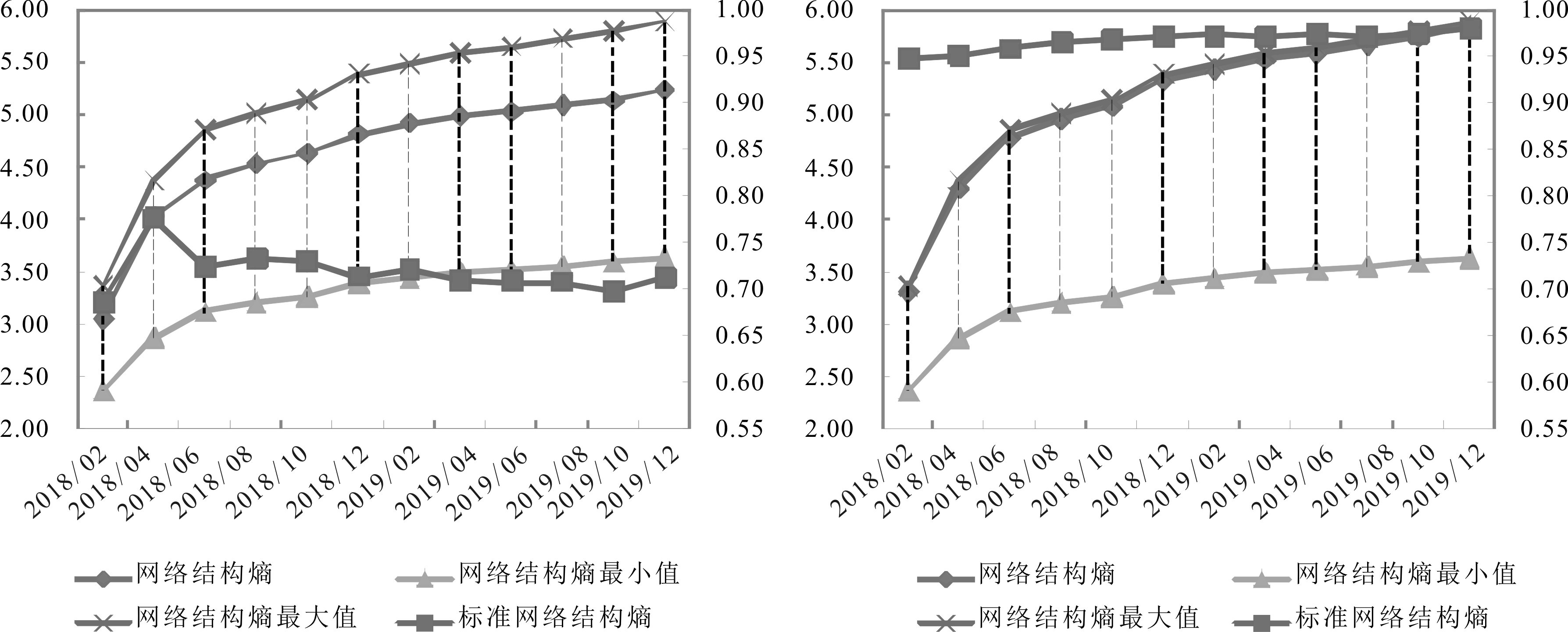 吴氏结构熵能够更加精确地反映出T孵化器网络的非同质性,为进一步比较分析,本文构建与T孵化器网络具有同等网络规模的随机网络。根据计算结果,T孵化器网络、同等规模随机网络的网络结构熵随时间演化规律如图4(a)、4(b)所示。首先,对于T孵化器网络,网络结构熵始终位于最大值与最小值之间,具有较为明显的有序性,从2018年2月的3.1逐渐上升到2019年12月的5.2,并且越到后期熵值上升趋势越平缓。除去网络规模增长所产生的熵增效应,标准网络结构熵在2018年4月迅速上升至0.78,之后逐渐下降为0.70,表明孵化网络经过前期较为明显的自组织过程之后,逐步朝着更加有序的方向演化。其次,对于同等规模随机网络,网络结构熵始终接近最大值,表现出无序性。除去网络规模的影响,标准网络结构熵始终处于0.95~1.00之间,明显高于T孵化器网络的标准网络结构熵,进一步印证了T孵化器网络演化的有序性。