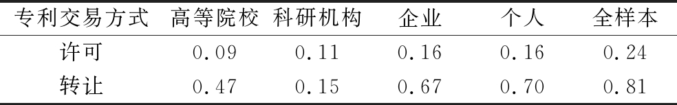 (1)4类创新主体专利交易差异较大,专利交易所需时间不同,专利交易特征存在明显差异,具体体现在技术领域、专利审查时间、专利性质等方面。其中,个人专利利用率最高,约为25.04%。其它类型创新主体专利交易率较低,均不超过5%;关于交易方式,方法专利更适合许可,产品专利更适合转让。在许可专利中,高等院校与企业占比较大;在转让专利中,企业与个人专利占比较大。