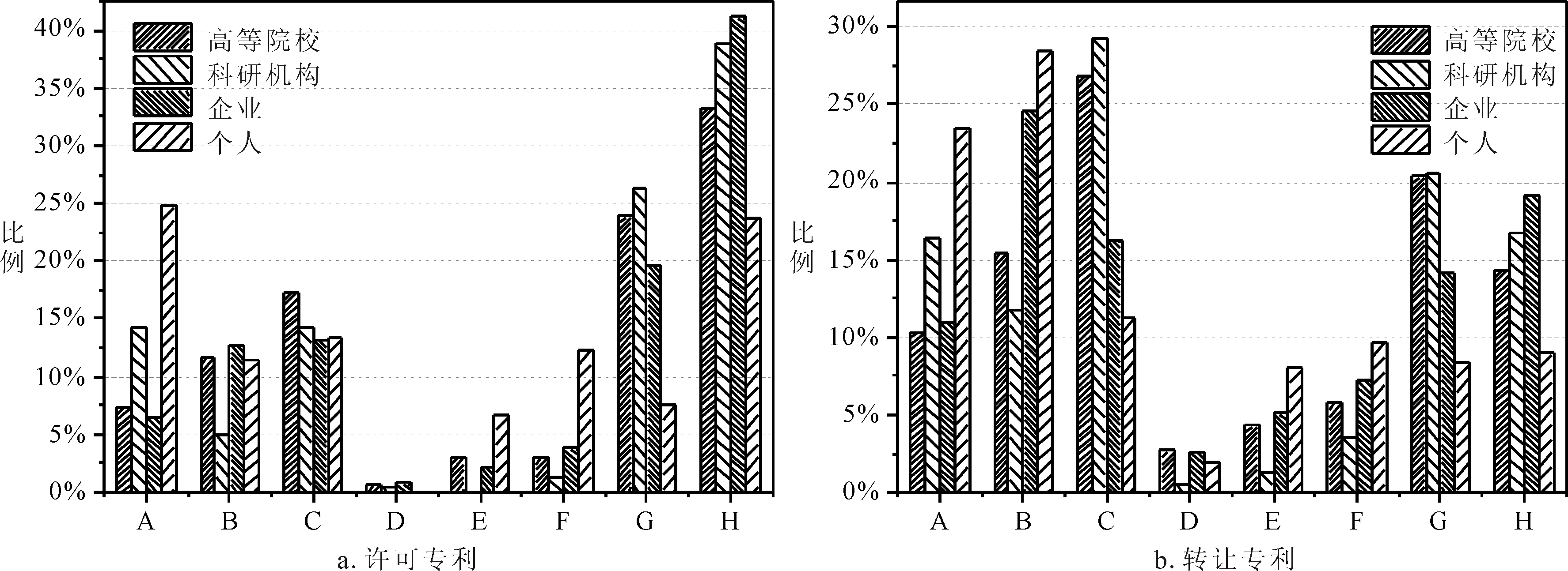 不同技术领域技术更新时间、技术时效性、技术生命周期不同,因而不同技术领域专利许可与转让存在差异。国际专利分类(IPC) 是根据专利文献所涉及的技术领域,为专利匹配一个或多个分类号。本文根据IPC分类,将专利划分为生活需要(A)、作业运输(B)、化学冶金(C)、纺织造纸(D)、固定建筑物(E)、机械工程(F)、物理(G)、电学(H)八大技术领域,对不同类型创新主体不同技术领域许可与转让专利进行分析,结果如图2所示。其中,左图为许可专利,右图为转让专利。从中可见,高等院校、科研机构许可与转让专利集中在化学冶金、物理及电学等专业性较强的基础研究领域;企业许可与转让专利不仅涉及化学冶金、物理等基础研究领域,还涉及作业运输相关领域,即企业在专业基础研究及日常应用研究领域发挥重要作用;个人许可与转让专利重点涉及生活需要与作业运输领域,说明个体创新者更注重解决日常生活中的技术问题。另外,纺织造纸、固定建筑物、机械工程3个领域专利占比较低,说明对各类创新主体而言,传统技术领域专利许可与转让低迷,需要提高传统技术领域专利市场交易比例。