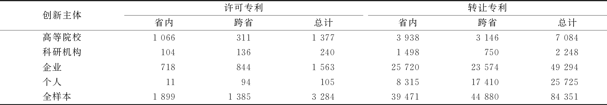 创新主体许可专利省内跨省总计转让专利省内跨省总计高等院校1 0663111 3773 9383 1467 084科研机构1041362401 4987502 248企业 7188441 56325 72023 57449 294个人 11941058 31517 41025 725全样本 1 8991 3853 28439 47144 88084 351