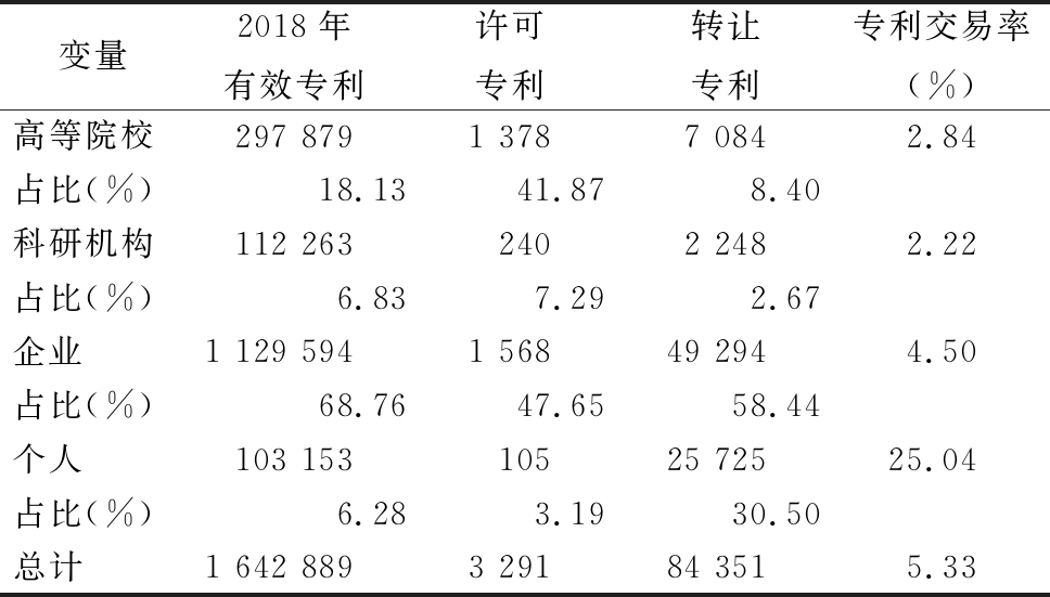 变量2018年有效专利许可专利转让专利专利交易率(%)高等院校297 8791 3787 0842.84占比(%)18.1341.878.40科研机构112 2632402 2482.22占比(%)6.837.292.67企业1 129 5941 56849 2944.50占比(%)68.7647.6558.44个人103 15310525 72525.04占比(%)6.283.1930.50总计1 642 8893 29184 3515.33