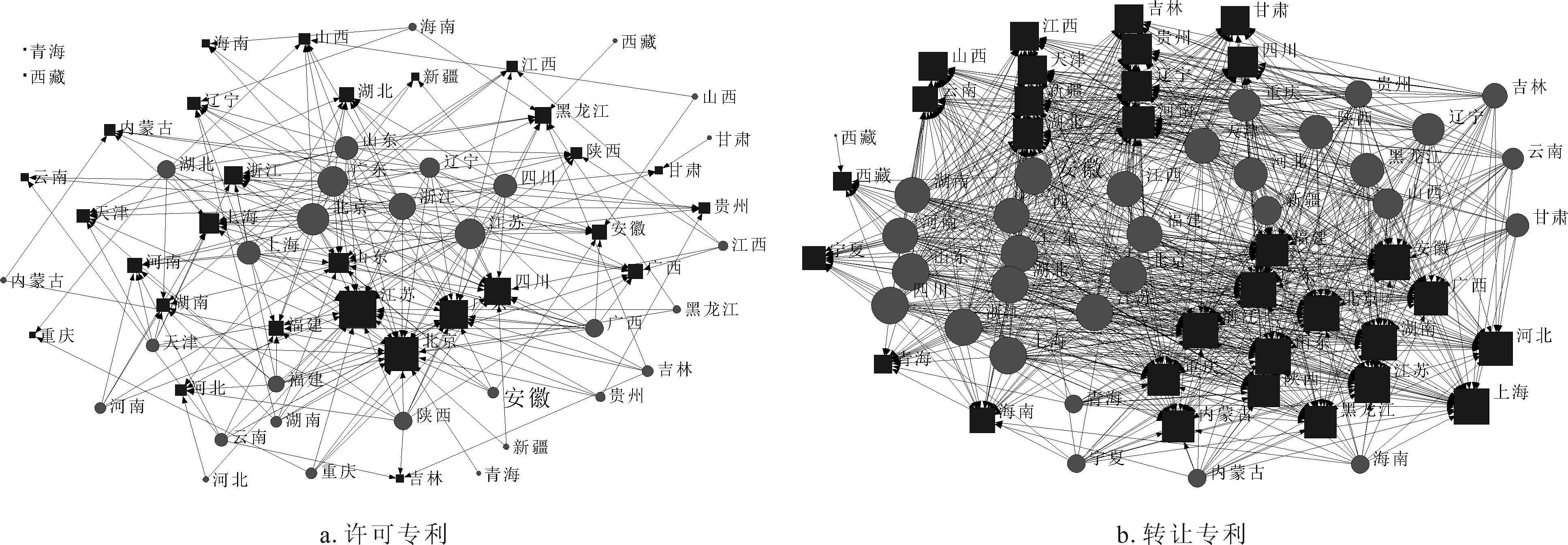 跨区域专利交易是指不同区域技术供给方和需求方交互行为所产生的区域间联系。专利许可与转让区域输出和输入网络是以省域为节点、以省域间专利输出与输入作为联系的有向网络。图4为2018年中国内地专利许可与转让区域输出和输入网络,节点越大说明该地区专利输出或输入数量越多。从中可见,中国内地有30个省域参与专利许可。虽然许可专利总体样本较小,许可专利网络密度较低,但仍能反映不同区域的专利许可数量及区域流动差距。从中可见,江苏、北京、广东输出与输入专利数量最多,属于专利许可活跃地区;四川、浙江、山东、上海专利输出与输入数量较多,属于专利许可次活跃地区。另外,黑龙江、河北、安徽等省份输入专利数量明显多于输出专利;相反,陕西、重庆、云南专利输出数量多于输入专利,青海、西藏只有专利输出而无专利输入。整体而言,在许可专利中,中国东部及东南部地区专利许可合作密度较高,其它地区专利流动关系脆弱,呈现出以江苏、北京、广东为中心并向其它地区辐射的复杂态势。图4b显示,共有31个省域参与专利转让,除西藏、宁夏、青海等西北部地区外,其余大部分地区都有大量专利输出和输入。对比专利许可与转让网络发现,许可专利空间分布不均衡,专利转让省际合作密度高于专利许可,专利地区差距较小,地区之间的合作关系更稳定。