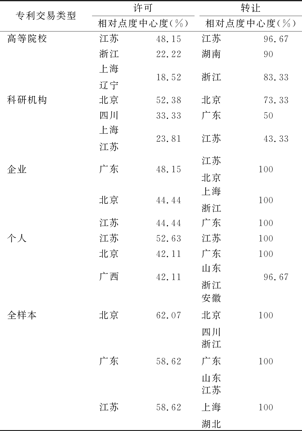 专利交易类型许可相对点度中心度(%)转让相对点度中心度(%)高等院校江苏48.15江苏96.67浙江22.22湖南90上海辽宁18.52浙江83.33科研机构北京52.38北京73.33四川33.33广东50上海江苏23.81江苏43.33企业广东48.15江苏北京100北京44.44上海浙江100江苏44.44广东100个人江苏52.63江苏100北京42.11广东100广西42.11山东浙江96.67全样本北京62.07安徽北京四川100广东58.62浙江广东山东100江苏58.62江苏上海湖北100