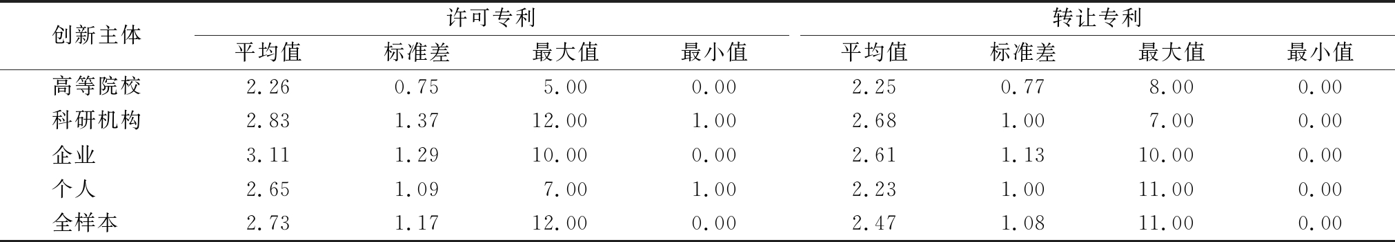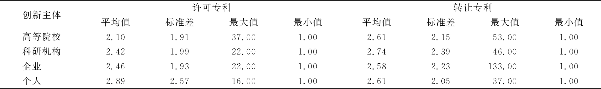 创新主体许可专利平均值标准差最大值最小值转让专利平均值标准差最大值最小值高等院校2.10 1.91 37.00 1.00 2.61 2.15 53.00 1.00 科研机构2.42 1.99 22.00 1.00 2.74 2.39 46.00 1.00 企业 2.46 1.93 22.00 1.00 2.58 2.23 133.00 1.00 个人 2.89 2.57 16.00 1.00 2.61 2.05 37.00 1.00