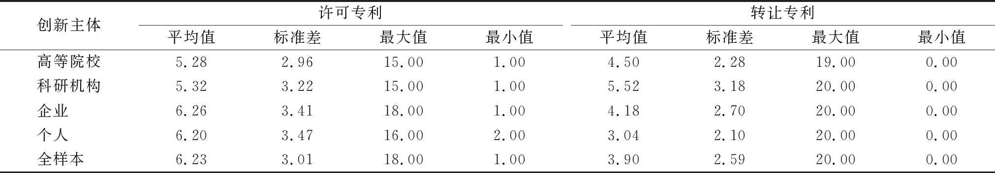 创新主体许可专利平均值标准差最大值最小值转让专利平均值标准差最大值最小值高等院校5.28 2.96 15.00 1.00 4.50 2.28 19.00 0.00 科研机构5.32 3.22 15.00 1.00 5.52 3.18 20.00 0.00 企业 6.26 3.41 18.00 1.00 4.18 2.70 20.00 0.00 个人 6.20 3.47 16.00 2.00 3.04 2.10 20.00 0.00 全样本 6.233.0118.00 1.00 3.902.5920.00 0.00
