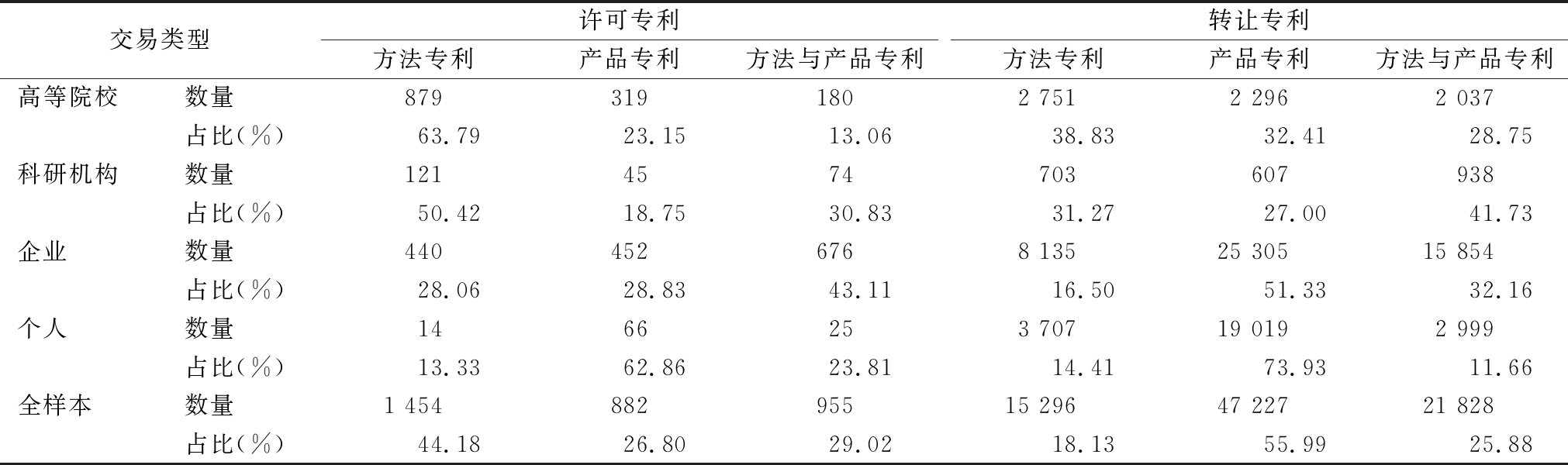 许可专利性质反映不同类型创新主体的侧重点。表4为不同类型创新主体方法专利、产品专利、方法和产品专利数量及其比重,可以看出不同类型创新主体的不同性质专利比例具有较大差异,说明不同类型创新主体的创新优势或创新基础明显不同。首先,全样本许可专利中方法专利占比最大,产品专利占比最小;相反,全样本转让专利中超过一半为产品专利,方法专利占比最小。据此可以判断,方法专利更适合许可,产品专利更适合转让。其次,各类创新主体许可与转让专利中,高等院校许可专利中方法专利占比高达63.79%,转让专利中方法专利占比最多,说明高等院校专利主要体现为制作流程与工艺创新,对产品创新关注较少。科研机构许可专利中超过半数为方法专利,但转让专利中方法与产品专利占比最多。企业许可专利中方法与产品专利占比最多,转让专利中超过半数为产品专利,说明科研机构与企业比较注重工艺方法创新与产品创新,这两类创新主体工艺和产品创新具有较强实力。对个人创新主体而言,许可专利与转让专利中产品专利占比最多,分别为62.86%和73.93%,说明个人更擅长产品创新,工艺与方法创新能力相对较弱。