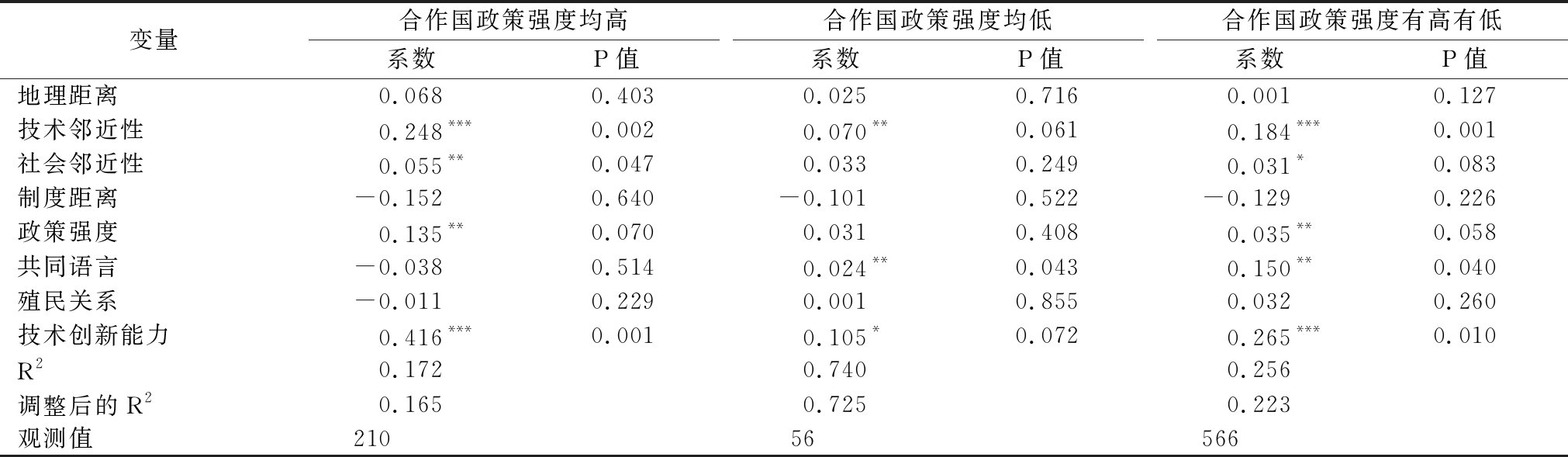 变量合作国政策强度均高系数P值合作国政策强度均低系数P值合作国政策强度有高有低系数P值地理距离0.0680.4030.0250.7160.0010.127技术邻近性0.248***0.0020.070**0.0610.184***0.001社会邻近性0.055**0.0470.0330.2490.031*0.083制度距离-0.1520.640-0.1010.522-0.1290.226政策强度0.135**0.0700.0310.4080.035**0.058共同语言-0.0380.5140.024**0.0430.150**0.040殖民关系-0.0110.2290.0010.8550.0320.260技术创新能力0.416***0.0010.105*0.0720.265***0.010R20.1720.7400.256调整后的R20.1650.7250.223观测值21056566