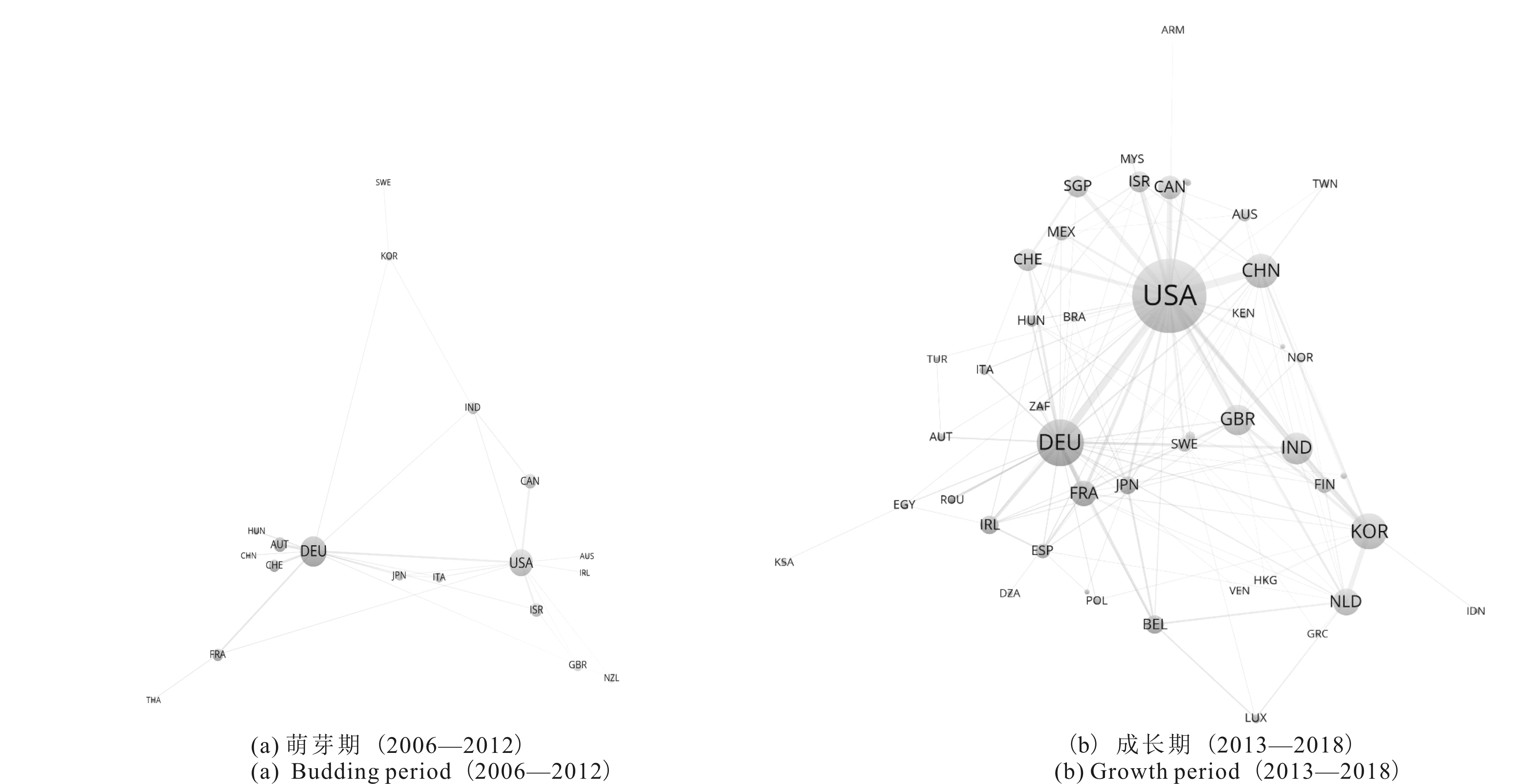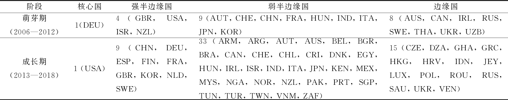 阶段核心国强半边缘国弱半边缘国边缘国萌芽期(2006—2012)1(DEU)4(GBR, USA, ISR, NZL)9 (AUT, CHE, CHN, FRA, HUN, IND, ITA, JPN, KOR)8 (AUS, CAN, IRL, RUS, SWE, THA, UKR, UZB)成长期(2013—2018)1 (USA)9 (CHN, DEU, ESP, FIN, FRA, GBR, KOR, NLD, SWE)33 (ARM, ARG, AUT, AUS, BEL, BGR, BRA, CAN, CHE, CHL, CRI, DNK, EGY, HUN, IRL, ISR, IND, ITA, JPN, KEN, MEX, MYS, NGA, NOR, NZL, PAK, PRT, SGP, TUN, TUR, TWN, VNM, ZAF)15 (CZE, DZA, GHA, GRC, HKG, HRV, IDN, JEY, LUX, POL, ROU, RUS, SAU, UKR, VEN)