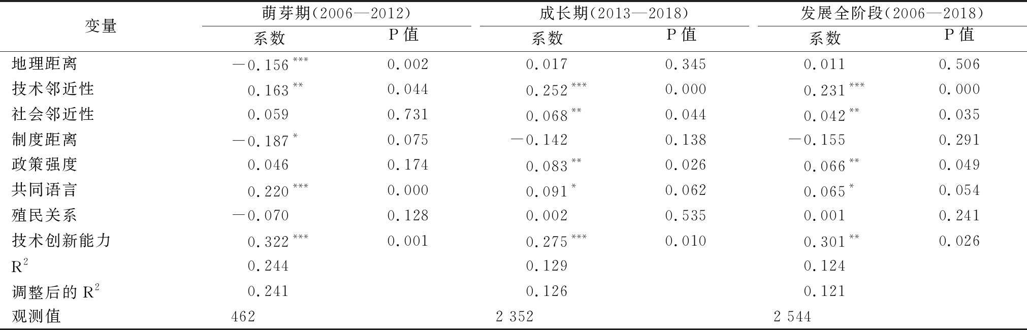 变量萌芽期(2006—2012)系数P值成长期(2013—2018)系数P值发展全阶段(2006—2018)系数P值地理距离-0.156***0.0020.0170.3450.0110.506技术邻近性0.163**0.0440.252***0.0000.231***0.000社会邻近性0.0590.7310.068**0.0440.042**0.035制度距离-0.187*0.075-0.1420.138-0.1550.291政策强度0.0460.1740.083**0.0260.066**0.049共同语言0.220***0.0000.091*0.0620.065*0.054殖民关系-0.0700.1280.0020.5350.0010.241技术创新能力0.322***0.0010.275***0.0100.301**0.026R20.2440.1290.124调整后的R20.2410.1260.121观测值4622 3522 544