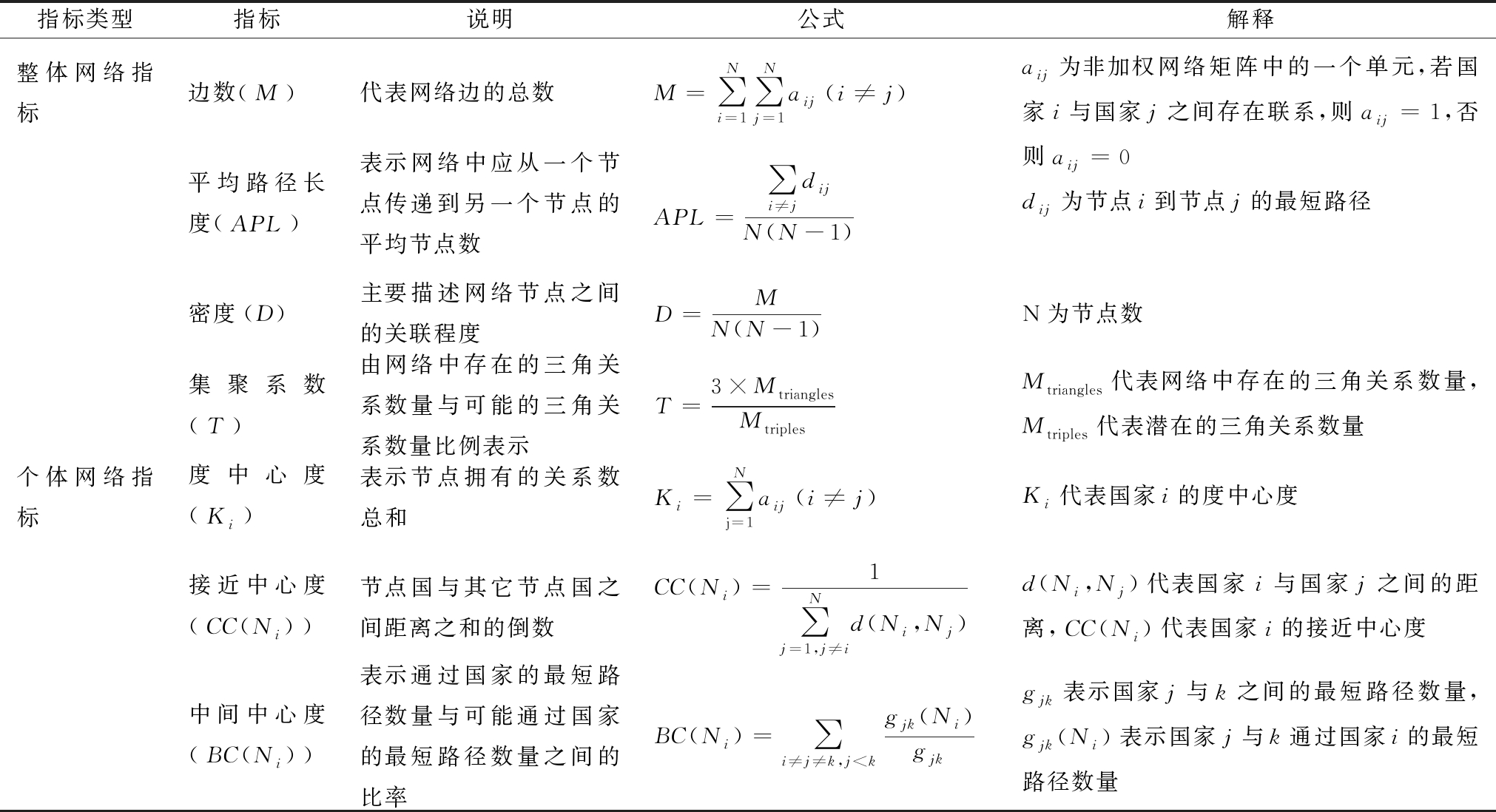 指标类型指标说明公式解释整体网络指标边数(M)代表网络边的总数M=∑Ni=1∑Nj=1aij(i≠j)aij为非加权网络矩阵中的一个单元,若国家i与国家j之间存在联系,则aij=1,否则aij=0平均路径长度( APL)表示网络中应从一个节点传递到另一个节点的平均节点数APL=∑i≠jdijN(N-1)dij为节点i到节点j的最短路径密度(D)主要描述网络节点之间的关联程度D=MN(N-1)N为节点数集聚系数(T)由网络中存在的三角关系数量与可能的三角关系数量比例表示T=3×MtrianglesMtriplesMtriangles代表网络中存在的三角关系数量,Mtriples代表潜在的三角关系数量个体网络指标度中心度(Ki)表示节点拥有的关系数总和Ki=∑Nj=1aij(i≠j)Ki代表国家i的度中心度接近中心度(CC(Ni))节点国与其它节点国之间距离之和的倒数CC(Ni)=1∑Nj=1,j≠id(Ni,Nj)d(Ni,Nj)代表国家i与国家j之间的距离,CC(Ni)代表国家i的接近中心度中间中心度(BC(Ni))表示通过国家的最短路径数量与可能通过国家的最短路径数量之间的比率BC(Ni)=∑i≠j≠k,j