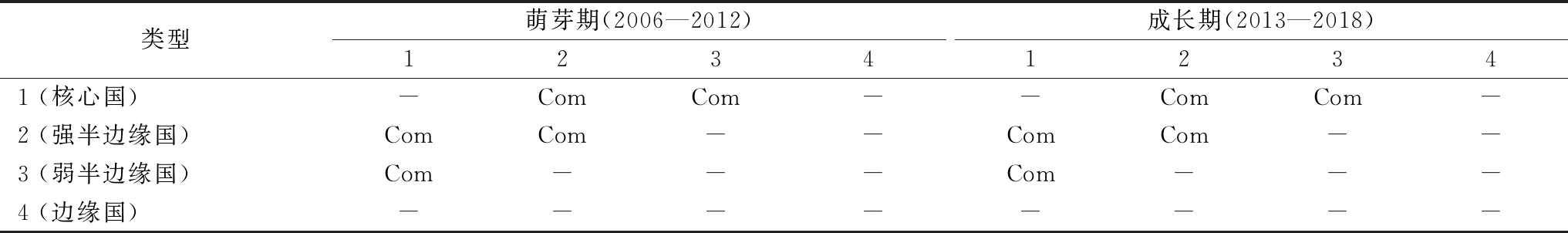类型萌芽期(2006—2012)1234成长期(2013—2018)12341 (核心国) -ComCom--ComCom-2 (强半边缘国) ComCom--ComCom--3 (弱半边缘国) Com---Com---4 (边缘国) --------