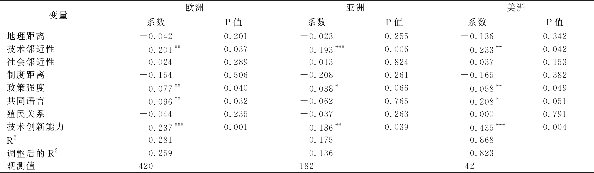 变量欧洲系数P值亚洲系数P值美洲系数P值地理距离-0.0420.201-0.0230.255-0.1360.342技术邻近性0.201**0.0370.193***0.0060.233**0.042社会邻近性0.0240.2890.0130.8240.0370.153制度距离-0.1540.506-0.2080.261-0.1650.382政策强度0.077**0.0400.038*0.0660.058**0.049共同语言0.096**0.032-0.0620.7650.208*0.051殖民关系-0.0440.235-0.0370.2630.0000.791技术创新能力0.237***0.0010.186**0.0390.435***0.004R20.2810.1750.868调整后的R20.2590.1360.823观测值42018242