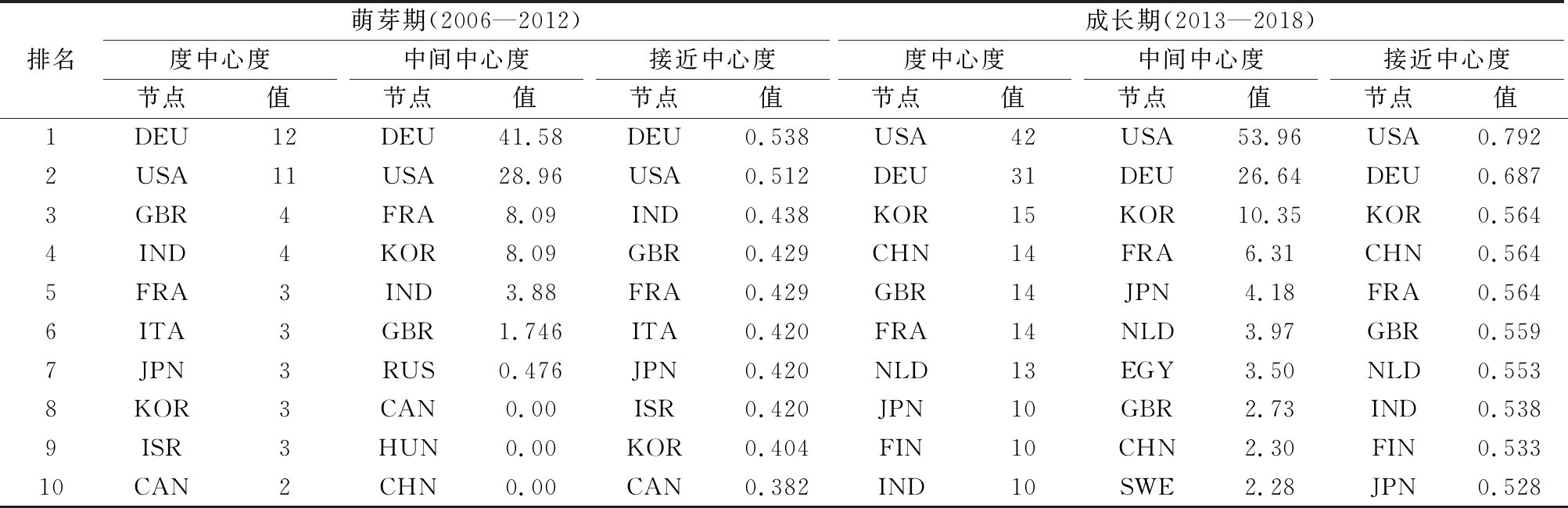 排名萌芽期(2006—2012)度中心度节点值中间中心度节点值接近中心度节点值成长期(2013—2018)度中心度节点值中间中心度节点值接近中心度节点值1DEU12DEU41.58DEU0.538USA42USA53.96USA0.7922USA11USA28.96USA0.512DEU31DEU26.64DEU0.6873GBR4FRA8.09IND 0.438KOR15KOR10.35KOR0.5644IND4KOR8.09GBR0.429CHN14FRA6.31CHN0.5645FRA3IND3.88FRA0.429GBR14JPN4.18FRA0.5646ITA3GBR1.746ITA0.420FRA14NLD3.97GBR0.5597JPN3RUS0.476JPN0.420NLD13EGY3.50NLD0.5538KOR3CAN0.00ISR0.420JPN10GBR2.73IND 0.5389ISR3HUN0.00KOR0.404FIN10CHN2.30FIN0.53310CAN2CHN0.00CAN0.382IND10SWE2.28JPN0.528