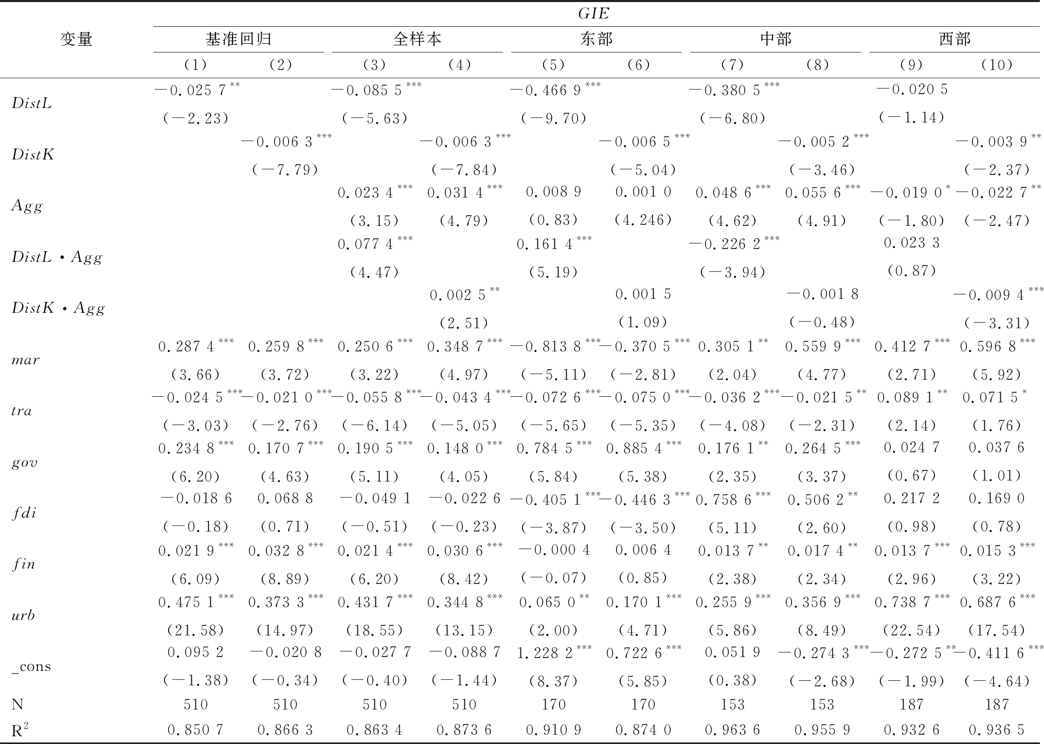 变量GIE基准回归(1)(2)全样本(3)(4)东部(5)(6)中部(7)(8)西部(9)(10)DistL-0.025 7**(-2.23)-0.085 5***(-5.63)-0.466 9***(-9.70)-0.380 5***(-6.80)-0.020 5(-1.14)DistK-0.006 3***(-7.79)-0.006 3***(-7.84)-0.006 5***(-5.04)-0.005 2***(-3.46)-0.003 9**(-2.37)Agg0.023 4***(3.15)0.031 4***(4.79)0.008 9(0.83)0.001 0(4.246)0.048 6***(4.62)0.055 6***(4.91)-0.019 0*(-1.80)-0.022 7**(-2.47)DistL·Agg0.077 4***(4.47)0.161 4***(5.19)-0.226 2***(-3.94)0.023 3(0.87)DistK·Agg0.002 5**(2.51)0.001 5(1.09)-0.001 8(-0.48)-0.009 4***(-3.31)mar0.287 4***(3.66)0.259 8***(3.72)0.250 6***(3.22)0.348 7***(4.97)-0.813 8***(-5.11)-0.370 5***(-2.81)0.305 1**(2.04)0.559 9***(4.77)0.412 7***(2.71)0.596 8***(5.92)tra-0.024 5***(-3.03)-0.021 0***(-2.76)-0.055 8***(-6.14)-0.043 4***(-5.05)-0.072 6***(-5.65)-0.075 0***(-5.35)-0.036 2***(-4.08)-0.021 5**(-2.31)0.089 1**(2.14)0.071 5*(1.76)gov0.234 8***(6.20)0.170 7***(4.63)0.190 5***(5.11)0.148 0***(4.05)0.784 5***(5.84)0.885 4***(5.38)0.176 1**(2.35)0.264 5***(3.37)0.024 7(0.67)0.037 6(1.01)fdi-0.018 6(-0.18)0.068 8(0.71)-0.049 1(-0.51)-0.022 6(-0.23)-0.405 1***(-3.87)-0.446 3***(-3.50)0.758 6***(5.11)0.506 2**(2.60)0.217 2(0.98)0.169 0(0.78)fin0.021 9***(6.09)0.032 8***(8.89)0.021 4***(6.20)0.030 6***(8.42)-0.000 4(-0.07)0.006 4(0.85)0.013 7**(2.38)0.017 4**(2.34)0.013 7***(2.96)0.015 3***(3.22)urb0.475 1***(21.58)0.373 3***(14.97)0.431 7***(18.55)0.344 8***(13.15)0.065 0**(2.00)0.170 1***(4.71)0.255 9***(5.86)0.356 9***(8.49)0.738 7***(22.54)0.687 6***(17.54)_cons0.095 2(-1.38)-0.020 8(-0.34)-0.027 7(-0.40)-0.088 7(-1.44)1.228 2***(8.37)0.722 6***(5.85)0.051 9(0.38)-0.274 3***(-2.68)-0.272 5**(-1.99)-0.411 6***(-4.64)N510510510510170170153153187187R20.850 70.866 30.863 40.873 60.910 90.874 00.963 60.955 90.932 60.936 5