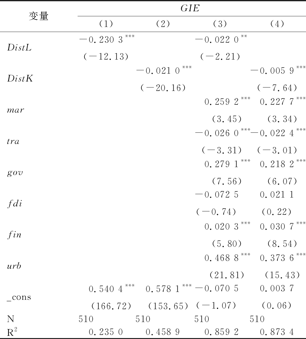 变量GIE(1)(2)(3)(4)DistL-0.230 3***(-12.13)-0.022 0**(-2.21)DistK-0.021 0***(-20.16)-0.005 9***(-7.64)mar0.259 2***(3.45)0.227 7***(3.34)tra-0.026 0***(-3.31)-0.022 4***(-3.01)gov0.279 1***(7.56)0.218 2***(6.07)fdi-0.072 5(-0.74)0.021 1(0.22)fin0.020 3***(5.80)0.030 7***(8.54)urb0.468 8***(21.81)0.373 6***(15.43)_cons0.540 4***(166.72)0.578 1***(153.65)-0.070 5(-1.07)0.003 7(0.06)N510510510510R20.235 00.458 90.859 20.873 4