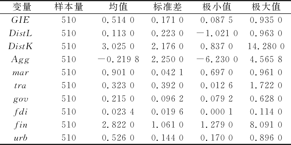 变量样本量均值标准差极小值极大值GIE5100.514 00.171 00.087 50.935 0DistL5100.113 00.223 0-1.021 00.963 0DistK5103.025 02.176 00.837 014.280 0Agg510-0.219 82.250 0-6.230 04.565 8mar5100.901 00.042 10.697 00.961 0tra5100.323 00.392 00.012 61.722 0gov5100.215 00.096 20.079 20.628 0fdi5100.023 40.019 60.000 10.114 0fin5102.822 01.061 01.279 08.091 0urb5100.526 00.144 00.170 00.896 0