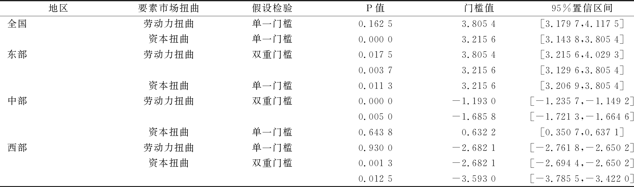地区要素市场扭曲假设检验P值门槛值95%置信区间全国劳动力扭曲单一门槛0.162 53.805 4[3.179 7,4.117 5]资本扭曲单一门槛0.000 03.215 6[3.143 8,3.805 4]东部劳动力扭曲双重门槛0.017 53.805 4[3.215 6,4.029 3]0.003 73.215 6[3.129 6,3.805 4]资本扭曲单一门槛0.011 33.215 6[3.206 9,3.805 4]中部劳动力扭曲双重门槛0.000 0-1.193 0[-1.235 7,-1.149 2]0.005 0-1.685 8[-1.721 3,-1.664 6]资本扭曲单一门槛0.643 80.632 2[0.350 7,0.637 1]西部劳动力扭曲单一门槛0.930 0-2.682 1[-2.761 8,-2.650 2]资本扭曲双重门槛0.001 3-2.682 1[-2.694 4,-2.650 2]0.012 5-3.593 0[-3.785 5,-3.422 0]