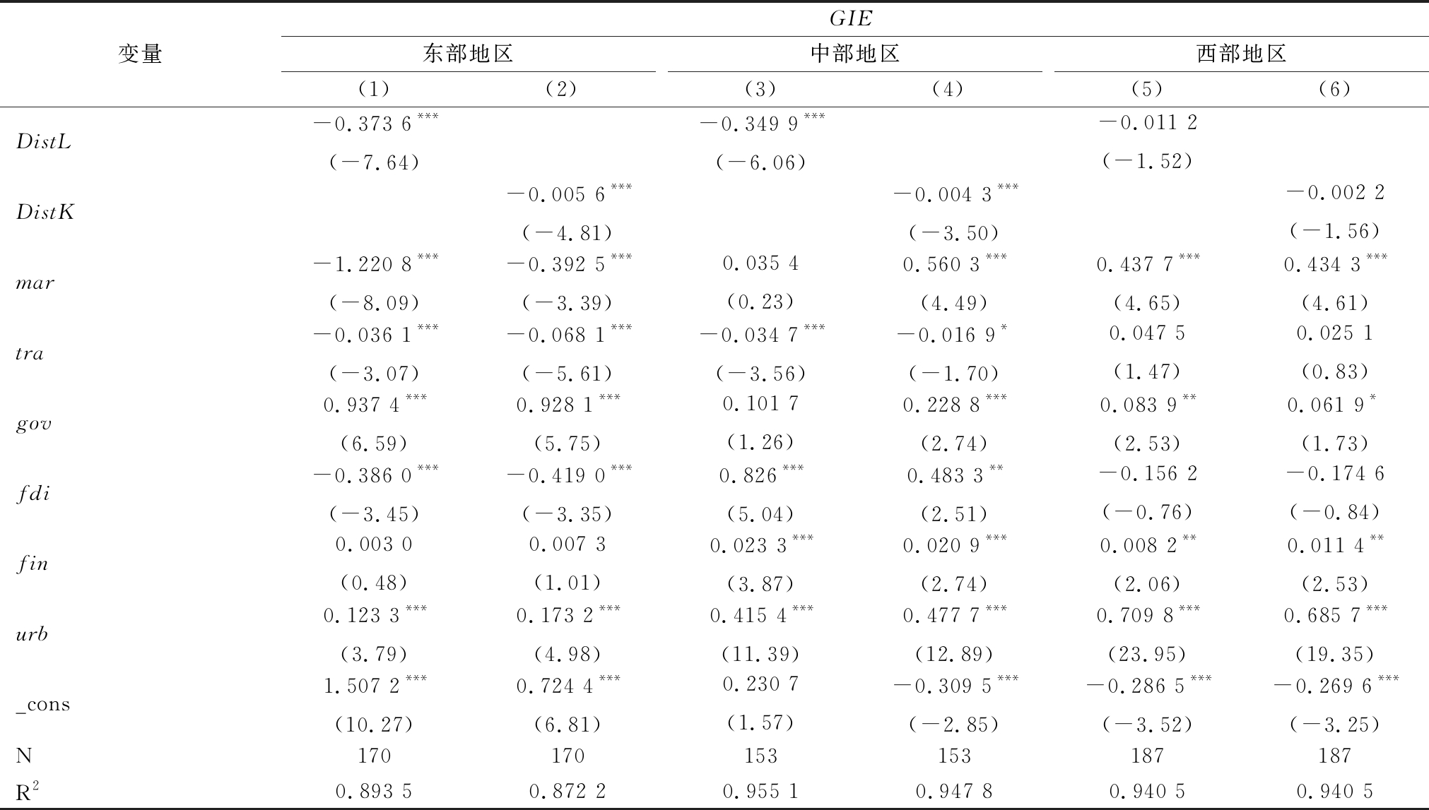 变量GIE东部地区(1)(2)中部地区(3)(4)西部地区(5)(6)DistL-0.373 6***(-7.64)-0.349 9***(-6.06)-0.011 2(-1.52)DistK-0.005 6***(-4.81)-0.004 3***(-3.50)-0.002 2(-1.56)mar-1.220 8***(-8.09)-0.392 5***(-3.39)0.035 4(0.23)0.560 3***(4.49)0.437 7***(4.65)0.434 3***(4.61)tra-0.036 1***(-3.07)-0.068 1***(-5.61)-0.034 7***(-3.56)-0.016 9*(-1.70)0.047 5(1.47)0.025 1(0.83)gov0.937 4***(6.59)0.928 1***(5.75)0.101 7(1.26)0.228 8***(2.74)0.083 9**(2.53)0.061 9*(1.73)fdi-0.386 0***(-3.45)-0.419 0***(-3.35)0.826***(5.04)0.483 3**(2.51)-0.156 2(-0.76)-0.174 6(-0.84)fin0.003 0(0.48)0.007 3(1.01)0.023 3***(3.87)0.020 9***(2.74)0.008 2**(2.06)0.011 4**(2.53)urb0.123 3***(3.79)0.173 2***(4.98)0.415 4***(11.39)0.477 7***(12.89)0.709 8***(23.95)0.685 7***(19.35)_cons1.507 2***(10.27)0.724 4***(6.81)0.230 7(1.57)-0.309 5***(-2.85)-0.286 5***(-3.52)-0.269 6***(-3.25)N170170153153187187R20.893 50.872 20.955 10.947 80.940 50.940 5