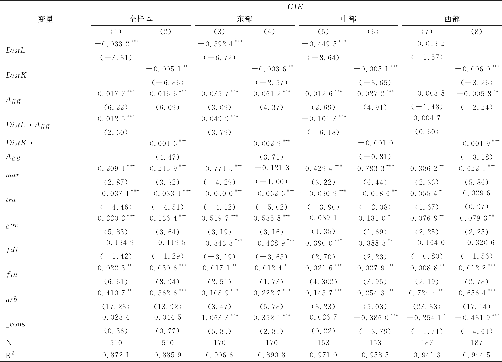 变量GIE全样本(1)(2)东部(3)(4)中部(5)(6)西部(7)(8)DistL-0.033 2***(-3.31)-0.392 4***(-6.72)-0.449 5***(-8.64)-0.013 2(-1.57)DistK-0.005 1***(-6.86)-0.003 6**(-2.57)-0.005 1***(-3.65)-0.006 0***(-3.26)Agg0.017 7***(6.22)0.016 6***(6.09)0.035 7***(3.09)0.061 2***(4.37)0.012 6***(2.69)0.027 2***(4.91)-0.003 8(-1.48)-0.005 8**(-2.24)DistL·Agg0.012 5***(2.60)0.049 9***(3.79)-0.101 3***(-6.18)0.004 7(0.60)DistK·Agg0.001 6***(4.47)0.002 9***(3.71)-0.001 0(-0.81)-0.001 9***(-3.18)mar0.209 1***(2.87)0.215 9***(3.32)-0.771 5***(-4.29)-0.121 3(-1.00)0.429 4***(3.22)0.783 3***(6.44)0.386 2**(2.36)0.622 1***(5.86)tra-0.037 1***(-4.46)-0.033 1***(-4.51)-0.050 0***(-4.12)-0.062 6***(-5.02)-0.030 9***(-3.90)-0.018 6**(-2.08)0.055 4*(1.67)0.029 6(0.97)gov0.220 2***(5.83)0.136 4***(3.64)0.519 7***(3.19)0.535 8***(3.16)0.089 1(1.35)0.131 0*(1.69)0.076 9**(2.25)0.079 3**(2.25)fdi-0.134 9(-1.42)-0.119 5(-1.29)-0.343 3***(-3.19)-0.428 9***(-3.63)0.390 0***(2.70)0.388 3**(2.23)-0.164 0(-0.80)-0.320 6(-1.56)fin0.022 3***(6.61)0.030 6***(8.94)0.017 1**(2.51)0.012 4*(1.73)0.021 6***(4.302)0.027 9***(3.95)0.008 8**(2.19)0.012 2***(2.78)urb0.410 7***(17.23)0.362 6***(13.92)0.108 9***(3.47)0.222 7***(5.78)0.143 7***(3.23)0.254 3***(5.03)0.724 4***(23.33)0.656 4***(17.14)_cons0.023 4(0.36)0.044 5(0.77)1.063 3***(5.85)0.352 1***(2.81)0.026 7(0.22)-0.386 0***(-3.79)-0.254 1*(-1.71)-0.431 9***(-4.61)N510510170170153153187187R20.872 10.885 90.906 60.890 80.971 00.958 50.941 30.944 5