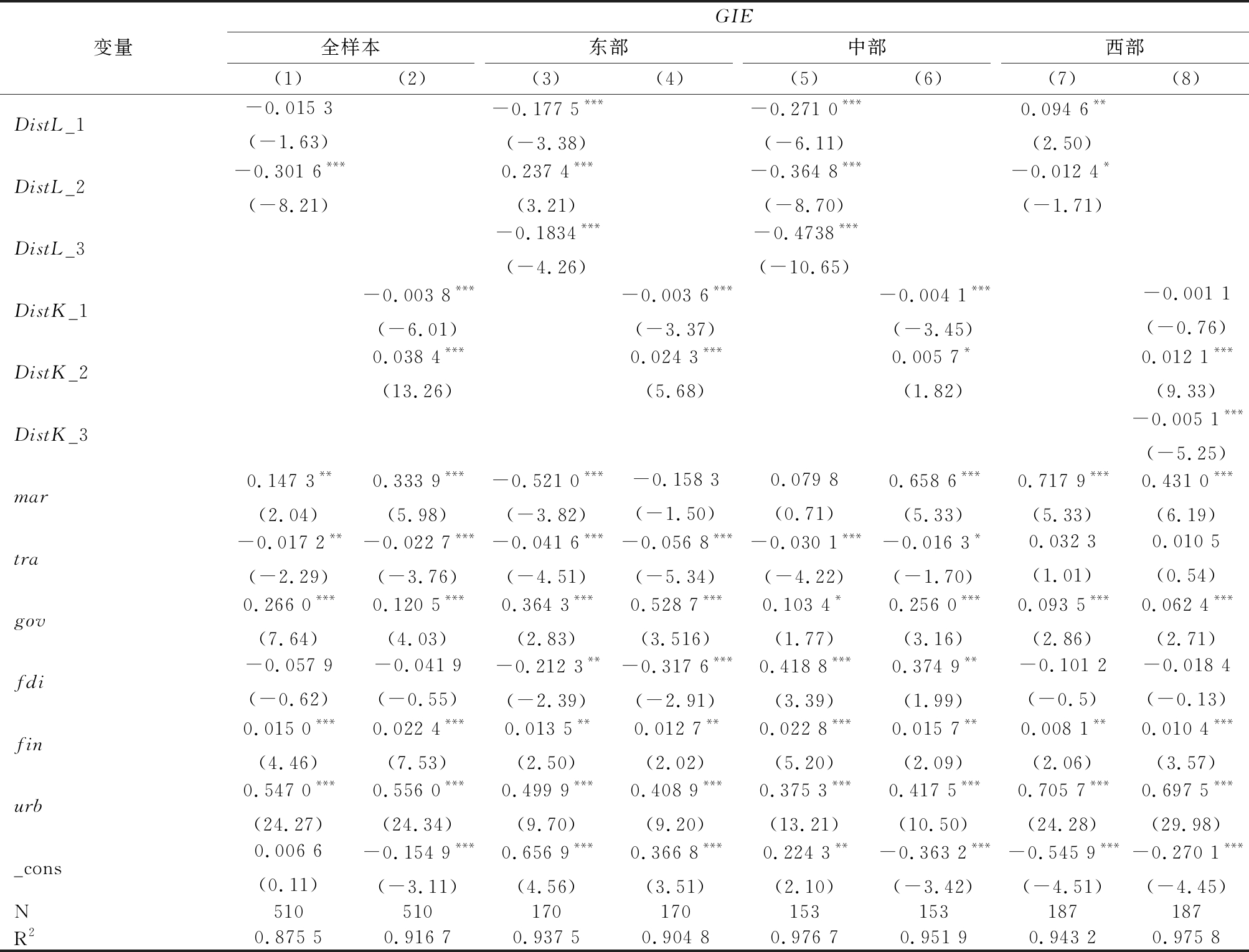 变量GIE全样本(1)(2)东部(3)(4)中部(5)(6)西部(7)(8)DistL_1-0.015 3(-1.63)-0.177 5***(-3.38)-0.271 0***(-6.11)0.094 6**(2.50)DistL_2-0.301 6***(-8.21)0.237 4***(3.21)-0.364 8***(-8.70)-0.012 4*(-1.71)DistL_3-0.1834***(-4.26)-0.4738***(-10.65)DistK_1-0.003 8***(-6.01)-0.003 6***(-3.37)-0.004 1***(-3.45)-0.001 1(-0.76)DistK_20.038 4***(13.26)0.024 3***(5.68)0.005 7*(1.82)0.012 1***(9.33)DistK_3-0.005 1***(-5.25)mar0.147 3**(2.04)0.333 9***(5.98)-0.521 0***(-3.82)-0.158 3(-1.50)0.079 8(0.71)0.658 6***(5.33)0.717 9***(5.33)0.431 0***(6.19)tra-0.017 2**(-2.29)-0.022 7***(-3.76)-0.041 6***(-4.51)-0.056 8***(-5.34)-0.030 1***(-4.22)-0.016 3*(-1.70)0.032 3(1.01)0.010 5(0.54)gov0.266 0***(7.64)0.120 5***(4.03)0.364 3***(2.83)0.528 7***(3.516)0.103 4*(1.77)0.256 0***(3.16)0.093 5***(2.86)0.062 4***(2.71)fdi-0.057 9(-0.62)-0.041 9(-0.55)-0.212 3**(-2.39)-0.317 6***(-2.91)0.418 8***(3.39)0.374 9**(1.99)-0.101 2(-0.5)-0.018 4(-0.13)fin0.015 0***(4.46)0.022 4***(7.53)0.013 5**(2.50)0.012 7**(2.02)0.022 8***(5.20)0.015 7**(2.09)0.008 1**(2.06)0.010 4***(3.57)urb0.547 0***(24.27)0.556 0***(24.34)0.499 9***(9.70)0.408 9***(9.20)0.375 3***(13.21)0.417 5***(10.50)0.705 7***(24.28)0.697 5***(29.98)_cons0.006 6(0.11)-0.154 9***(-3.11)0.656 9***(4.56)0.366 8***(3.51)0.224 3**(2.10)-0.363 2***(-3.42)-0.545 9***(-4.51)-0.270 1***(-4.45)N510510170170153153187187R20.875 50.916 70.937 50.904 80.976 70.951 90.943 20.975 8