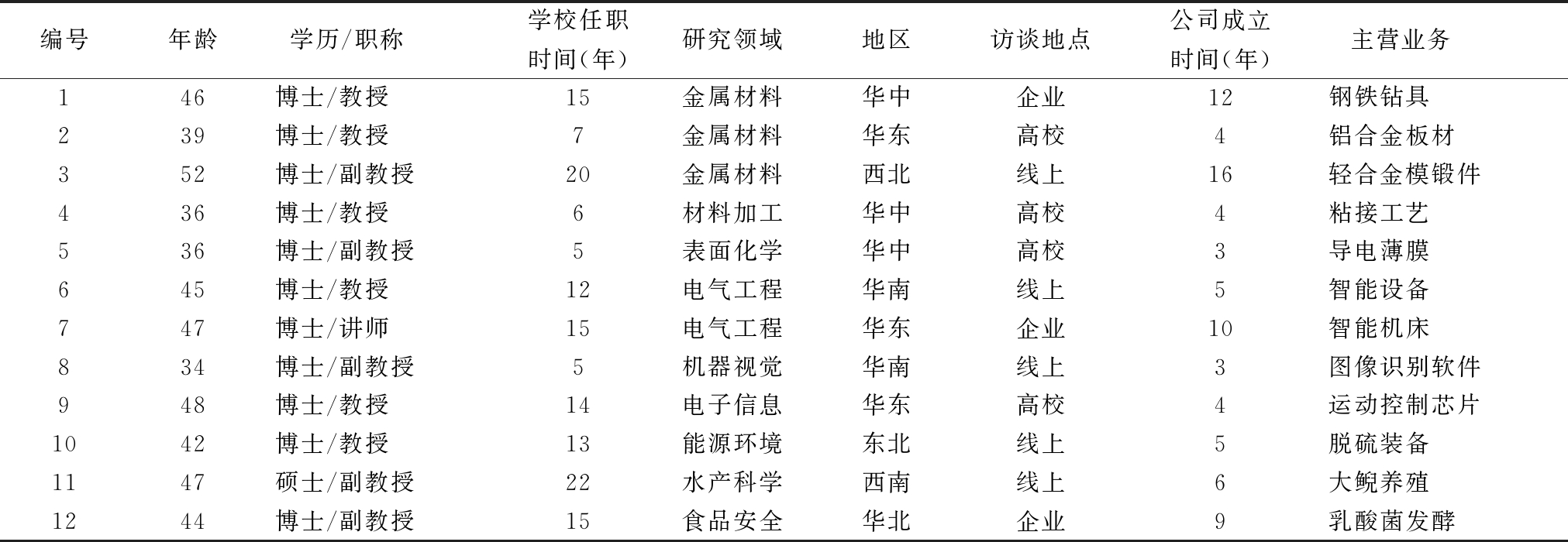 编号年龄学历/职称 学校任职时间(年)研究领域地区访谈地点公司成立时间(年)主营业务 146博士/教授15金属材料华中企业12钢铁钻具239博士/教授7金属材料华东高校4铝合金板材352博士/副教授20金属材料西北线上16轻合金模锻件436博士/教授6材料加工华中高校4粘接工艺536博士/副教授5表面化学华中高校3导电薄膜645博士/教授12电气工程华南线上5智能设备747博士/讲师15电气工程华东企业10智能机床834博士/副教授5机器视觉华南线上3图像识别软件948博士/教授14电子信息华东高校4运动控制芯片1042博士/教授13能源环境东北线上5脱硫装备1147硕士/副教授22水产科学西南线上6大鲵养殖1244博士/副教授15食品安全华北企业9乳酸菌发酵