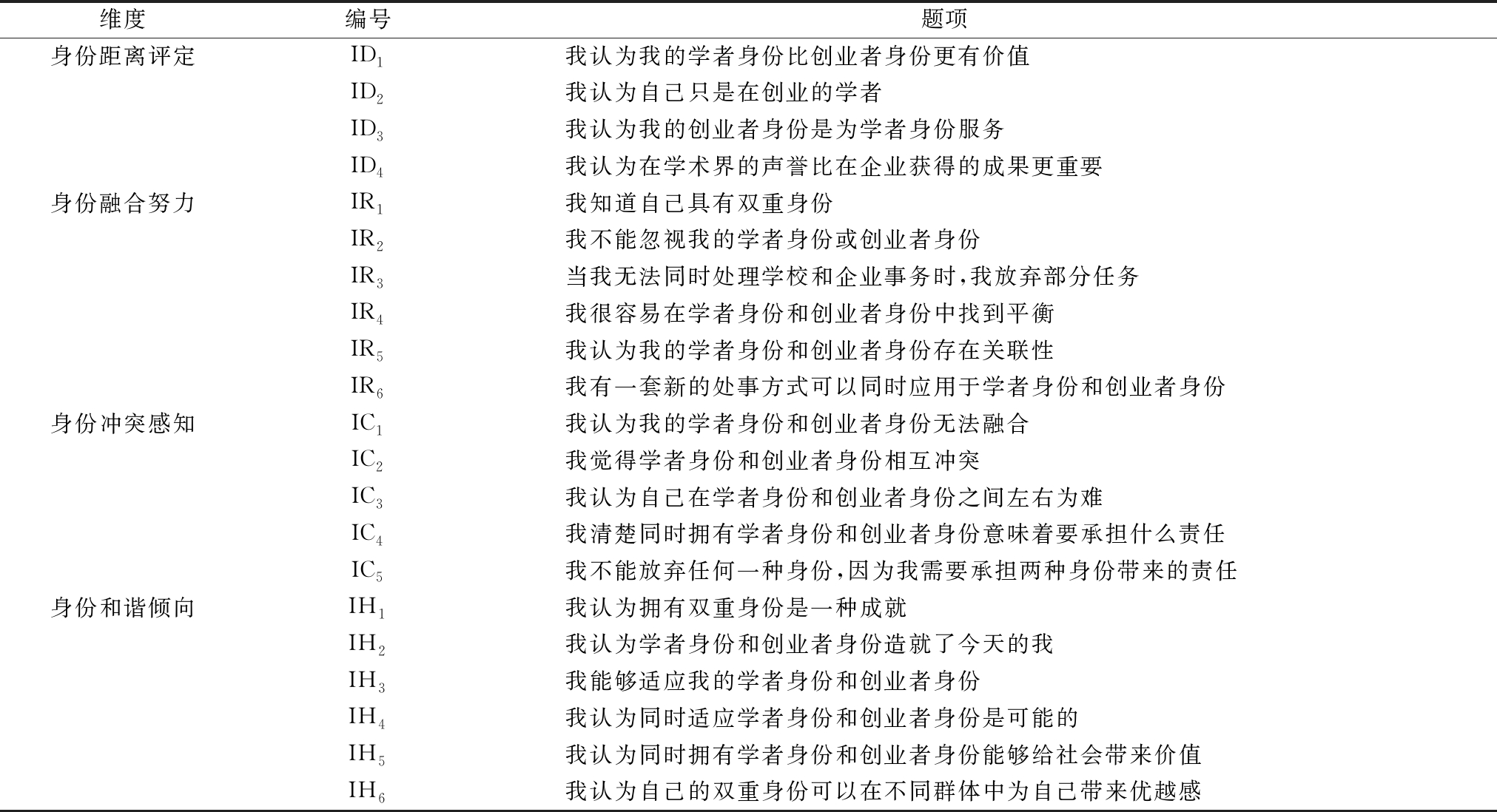 维度编号题项 身份距离评定ID1我认为我的学者身份比创业者身份更有价值ID2我认为自己只是在创业的学者ID3我认为我的创业者身份是为学者身份服务ID4我认为在学术界的声誉比在企业获得的成果更重要身份融合努力IR1我知道自己具有双重身份IR2我不能忽视我的学者身份或创业者身份IR3当我无法同时处理学校和企业事务时,我放弃部分任务IR4我很容易在学者身份和创业者身份中找到平衡IR5我认为我的学者身份和创业者身份存在关联性IR6我有一套新的处事方式可以同时应用于学者身份和创业者身份身份冲突感知IC1我认为我的学者身份和创业者身份无法融合IC2我觉得学者身份和创业者身份相互冲突IC3我认为自己在学者身份和创业者身份之间左右为难IC4我清楚同时拥有学者身份和创业者身份意味着要承担什么责任IC5我不能放弃任何一种身份,因为我需要承担两种身份带来的责任身份和谐倾向IH1我认为拥有双重身份是一种成就IH2我认为学者身份和创业者身份造就了今天的我IH3我能够适应我的学者身份和创业者身份IH4我认为同时适应学者身份和创业者身份是可能的IH5我认为同时拥有学者身份和创业者身份能够给社会带来价值IH6我认为自己的双重身份可以在不同群体中为自己带来优越感