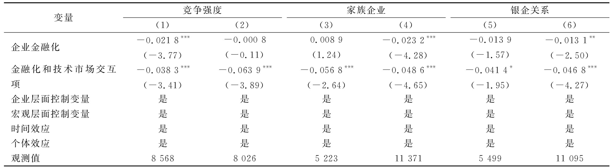 考虑到技术市场发展对企业创新质量的重要性,金融化对企业创新质量的影响效应在不同技术市场发展水平下应存在明显差异。为验证实体企业金融化对创新质量的影响效应随技术市场发展水平变化而变化,在模型(1)基础上进行扩展,通过引入技术市场发展水平与实体企业金融化水平的交互项,构建技术市场发展水平的调节效应模型。