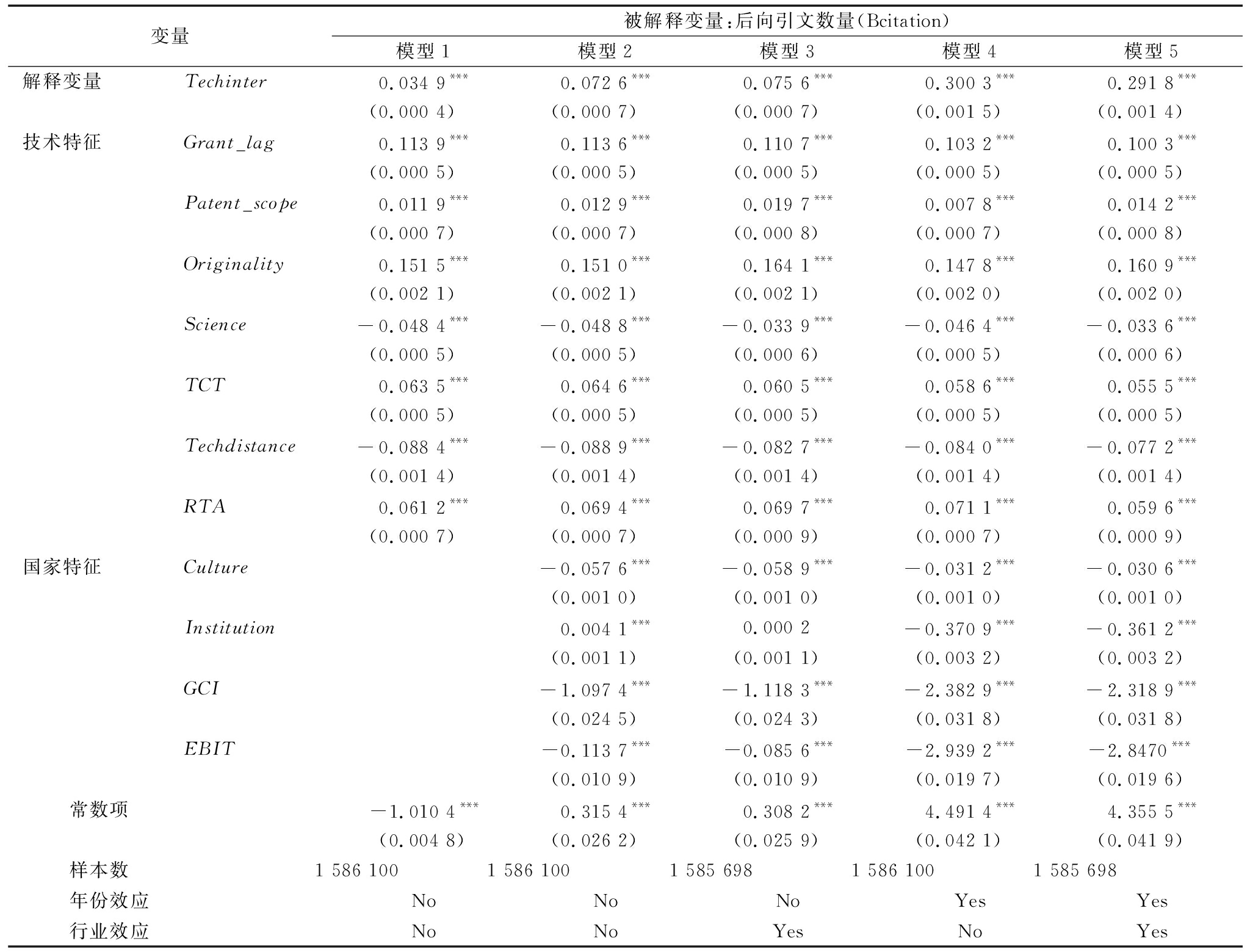 变量被解释变量:后向引文数量(Bcitation)模型1模型2模型3模型4模型5解释变量Techinter0.034 9***0.072 6***0.075 6***0.300 3***0.291 8***(0.000 4)(0.000 7)(0.000 7)(0.001 5)(0.001 4)技术特征Grant_lag0.113 9***0.113 6***0.110 7***0.103 2***0.100 3***(0.000 5)(0.000 5)(0.000 5)(0.000 5)(0.000 5)Patent_scope0.011 9***0.012 9***0.019 7***0.007 8***0.014 2***(0.000 7)(0.000 7)(0.000 8)(0.000 7)(0.000 8)Originality0.151 5***0.151 0***0.164 1***0.147 8***0.160 9***(0.002 1)(0.002 1)(0.002 1)(0.002 0)(0.002 0)Science-0.048 4***-0.048 8***-0.033 9***-0.046 4***-0.033 6***(0.000 5)(0.000 5)(0.000 6)(0.000 5)(0.000 6)TCT0.063 5***0.064 6***0.060 5***0.058 6***0.055 5***(0.000 5)(0.000 5)(0.000 5)(0.000 5)(0.000 5)Techdistance-0.088 4***-0.088 9***-0.082 7***-0.084 0***-0.077 2***(0.001 4)(0.001 4)(0.001 4)(0.001 4)(0.001 4)RTA0.061 2***0.069 4***0.069 7***0.071 1***0.059 6***(0.000 7)(0.000 7)(0.000 9)(0.000 7)(0.000 9)国家特征Culture-0.057 6***-0.058 9***-0.031 2***-0.030 6***(0.001 0)(0.001 0)(0.001 0)(0.001 0)Institution0.004 1***0.000 2-0.370 9***-0.361 2***(0.001 1)(0.001 1)(0.003 2)(0.003 2)GCI-1.097 4***-1.118 3***-2.382 9***-2.318 9***(0.024 5)(0.024 3)(0.031 8)(0.031 8)EBIT-0.113 7***-0.085 6***-2.939 2***-2.8470***(0.010 9)(0.010 9)(0.019 7)(0.019 6)常数项-1.010 4***0.315 4***0.308 2***4.491 4***4.355 5***(0.004 8)(0.026 2)(0.025 9)(0.042 1)(0.041 9)样本数1 586 1001 586 1001 585 6981 586 1001 585 698年份效应NoNoNoYesYes行业效应NoNoYesNoYes