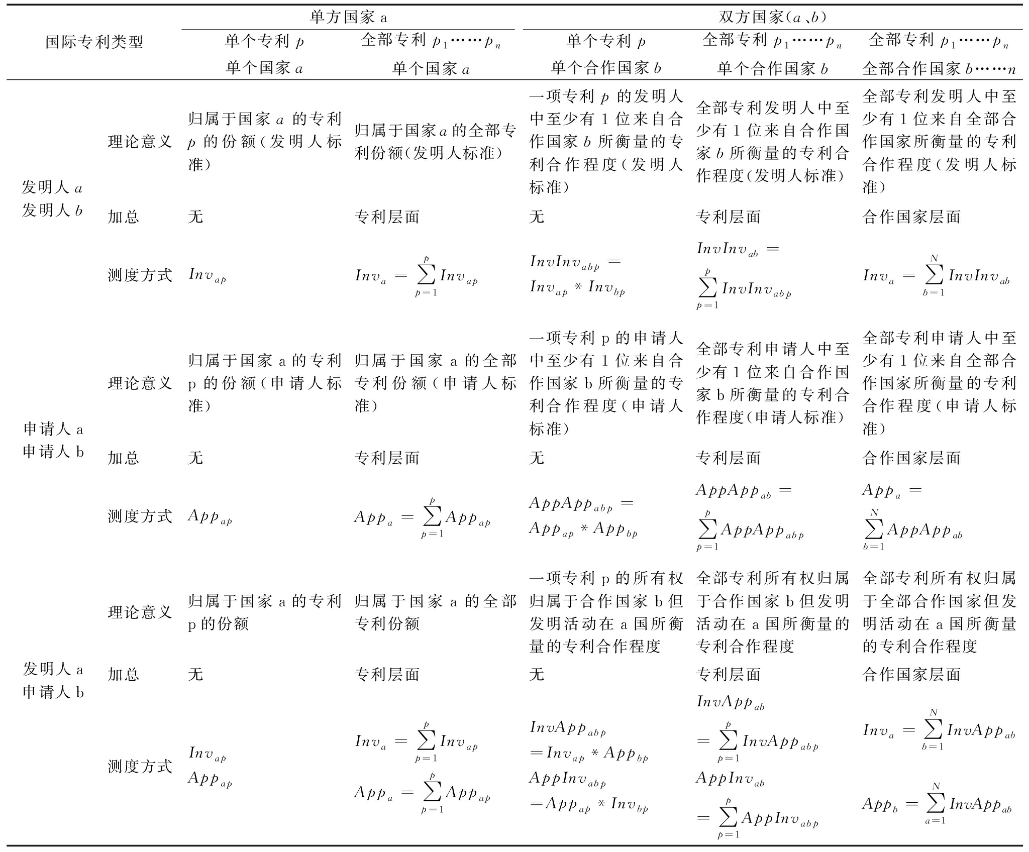国际专利类型单方国家a单个专利p单个国家a全部专利p1……pn单个国家a双方国家(a、b)单个专利p单个合作国家b全部专利p1……pn单个合作国家b全部专利p1……pn全部合作国家b……n发明人a发明人b理论意义归属于国家a的专利p的份额(发明人标准)归属于国家a的全部专利份额(发明人标准)一项专利p的发明人中至少有1位来自合作国家b所衡量的专利合作程度(发明人标准)全部专利发明人中至少有1位来自合作国家b所衡量的专利合作程度(发明人标准)全部专利发明人中至少有1位来自全部合作国家所衡量的专利合作程度(发明人标准)加总 无专利层面无专利层面合作国家层面测度方式InvapInva=∑pp=1InvapInvInvabp=Invap*InvbpInvInvab=∑pp=1InvInvabpInva=∑Nb=1InvInvab申请人a申请人b理论意义归属于国家a的专利p的份额(申请人标准)归属于国家a的全部专利份额(申请人标准)一项专利p的申请人中至少有1位来自合作国家b所衡量的专利合作程度(申请人标准)全部专利申请人中至少有1位来自合作国家b所衡量的专利合作程度(申请人标准)全部专利申请人中至少有1位来自全部合作国家所衡量的专利合作程度(申请人标准)加总 无专利层面无专利层面合作国家层面测度方式AppapAppa=∑pp=1AppapAppAppabp=Appap*AppbpAppAppab=∑pp=1AppAppabpAppa=∑Nb=1AppAppab发明人a申请人b理论意义归属于国家a的专利p的份额归属于国家a的全部专利份额一项专利p的所有权归属于合作国家b但发明活动在a国所衡量的专利合作程度全部专利所有权归属于合作国家b但发明活动在a国所衡量的专利合作程度全部专利所有权归属于全部合作国家但发明活动在a国所衡量的专利合作程度加总 无专利层面无专利层面合作国家层面测度方式InvapAppapInva=∑pp=1InvapAppa=∑pp=1AppapInvAppabp=Invap*AppbpAppInvabp=Appap*InvbpInvAppab=∑pp=1InvAppabpAppInvab=∑pp=1AppInvabpInva=∑Nb=1InvAppabAppb=∑Na=1InvAppab