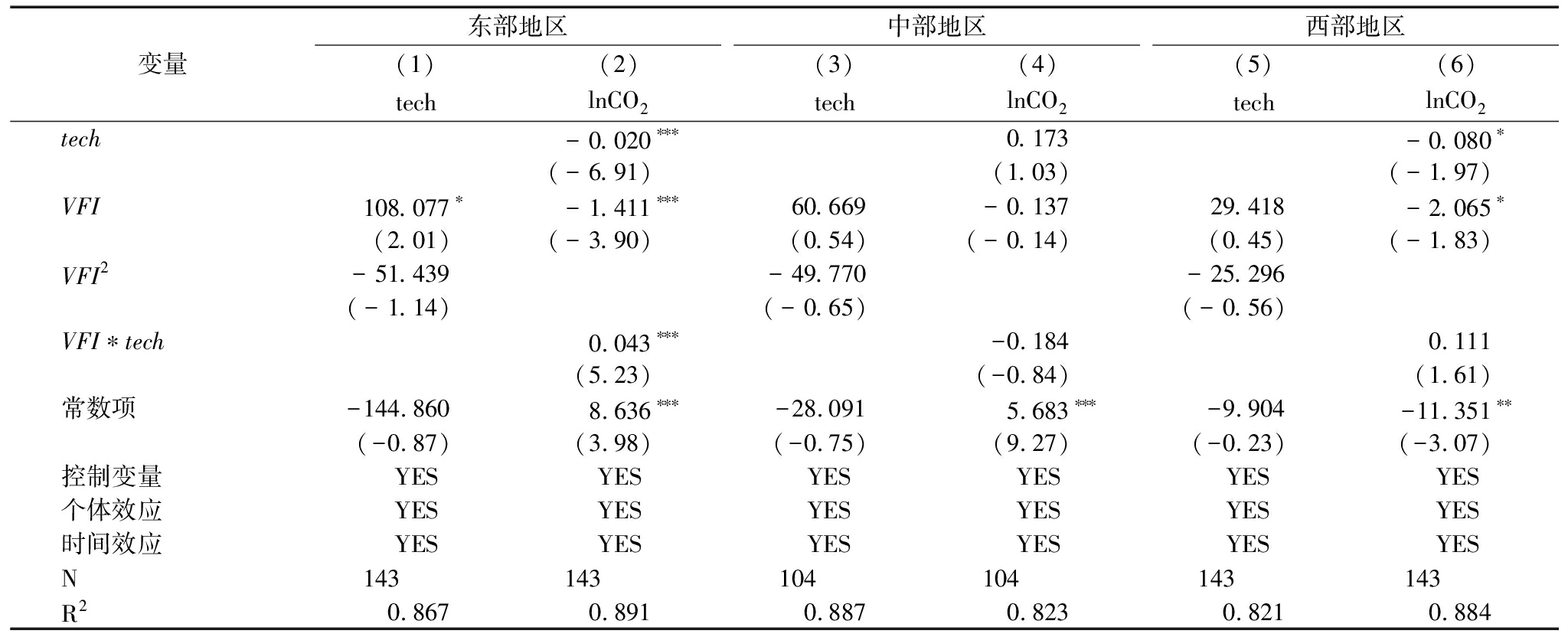变量东部地区(1)(2)techlnCO2中部地区(3)(4)techlnCO2西部地区(5)(6)techlnCO2tech-0.020∗∗∗ 0.173-0.080∗(-6.91)(1.03)(-1.97)VFI108.077∗-1.411∗∗∗60.669-0.13729.418-2.065∗(2.01)(-3.90)(0.54)(-0.14)(0.45)(-1.83)VFI2-51.439-49.770-25.296(-1.14)(-0.65)(-0.56)VFI∗tech 0.043∗∗∗-0.1840.111(5.23)(-0.84)(1.61)常数项-144.8608.636∗∗∗-28.0915.683∗∗∗-9.904-11.351∗∗(-0.87)(3.98)(-0.75)(9.27)(-0.23)(-3.07)控制变量YESYESYESYESYESYES个体效应YESYESYESYESYESYES时间效应YESYESYESYESYESYESN143143104104143143R20.8670.8910.8870.8230.8210.884