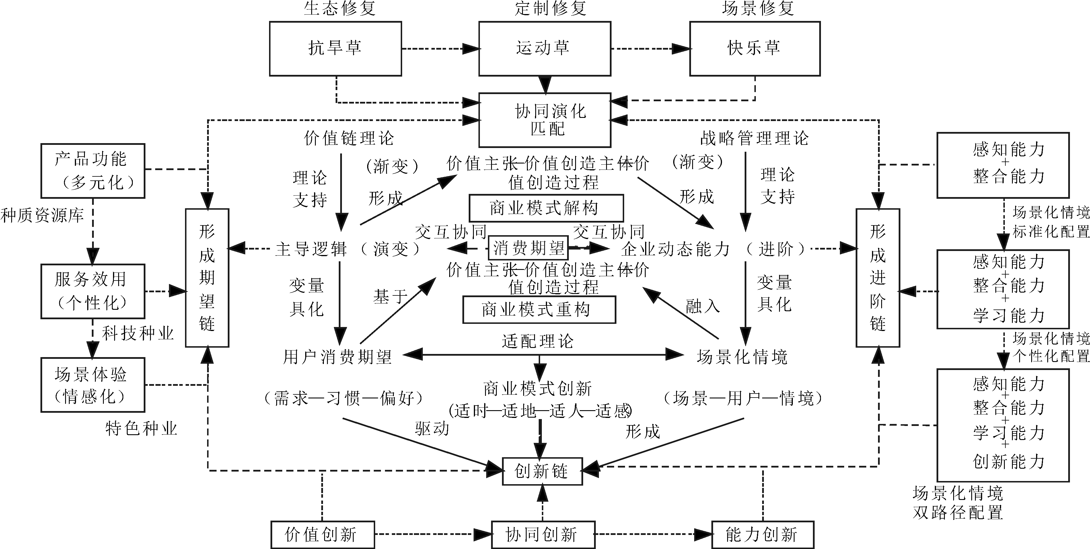 如图6所示,结合蒙草生态案例分析可以发现,场景基于价值主导逻辑演变与企业动态能力进阶交互赋能商业模式创新是通过以下几个阶段实现的:一是产品功能提供阶段。企业基于当前产品功能发展目标,通过“感知市场机遇—整合各类情境资源”的动态能力,改变企业经营目标,聚焦“抗旱小草”,抢占生态修复市场。二是服务效用提供阶段。由于“抗旱小草”发展进入瓶颈期,企业通过分析行业前景,推动价值主导逻辑从产品功能向服务效用演变,通过“感知行业发展趋势—整合各类情境资源—强化组织学习能力”的企业动态能力进阶,借助专家团队、科研团体等,形成以探索开发技术为导向的个性化定制修复模式——“运动小草”,学习与引进定制修复技术,拓展企业发展资源,突破企业发展瓶颈。三是场景体验提供阶段。随着近年来场景化修复的兴起,场景修复市场蓬勃发展,企业适时变革,推动价值主导逻辑向场景体验演变,形成“感知和捕捉市场机遇—整合各类情境资源—学习场景化修复技术—形成创新发展平台”的场景修复模式——“快乐小草”,实现产业联盟内的价值共创与共享。企业商业模式创新经历了“价值主导逻辑演变—交互—企业动态能力进阶”的形成过程,企业应根据环境变化,适时、主动加快价值主导逻辑演变,同时推动企业动态能力进阶,通过丰富情境要素并强化其功能实现场景化商业模式的精细化配置进而形成企业新的动态能力,最终找到商业模式创新的最优路径。