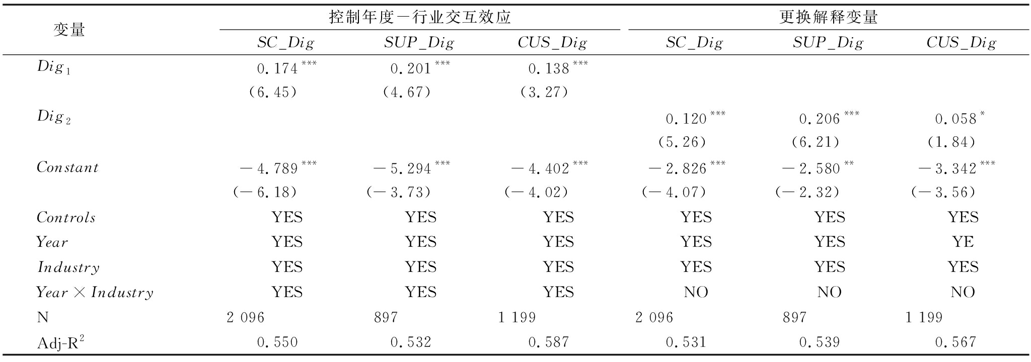 变量控制年度-行业交互效应SC_DigSUP_DigCUS_Dig更换解释变量SC_DigSUP_DigCUS_DigDig10.174***0.201***0.138***(6.45)(4.67)(3.27)Dig20.120***0.206***0.058*(5.26)(6.21)(1.84)Constant-4.789***-5.294***-4.402***-2.826***-2.580**-3.342***(-6.18)(-3.73)(-4.02)(-4.07)(-2.32)(-3.56)ControlsYESYESYESYESYESYESYearYESYESYESYESYESYEIndustryYESYESYESYESYESYESYear×IndustryYESYESYESNONONON2 0968971 1992 0968971 199Adj-R20.5500.5320.5870.5310.5390.567