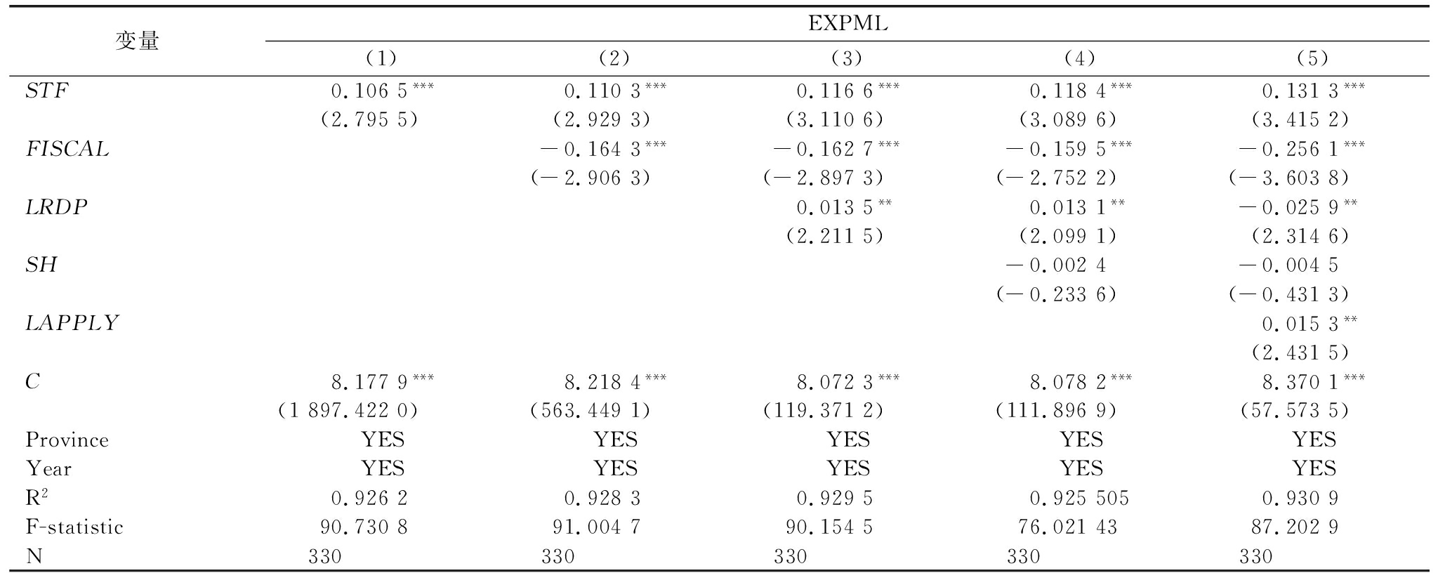 变量EXPML(1)(2)(3)(4)(5)STF0.1065***0.1103***0.1166***0.1184***0.1313***(2.7955)(2.9293)(3.1106)(3.0896)(3.4152)FISCAL-0.1643***-0.1627***-0.1595***-0.2561***(-2.9063)(-2.8973)(-2.7522)(-3.6038)LRDP0.0135**0.0131**-0.0259**(2.2115)(2.0991)(2.3146)SH-0.0024-0.0045(-0.2336)(-0.4313)LAPPLY0.0153**(2.4315)C8.1779***8.2184***8.0723***8.0782***8.3701***(1897.4220)(563.4491)(119.3712)(111.8969)(57.5735)ProvinceYESYESYESYESYESYearYESYESYESYESYESR20.92620.92830.92950.9255050.9309F-statistic90.730891.004790.154576.0214387.2029N330330330330330