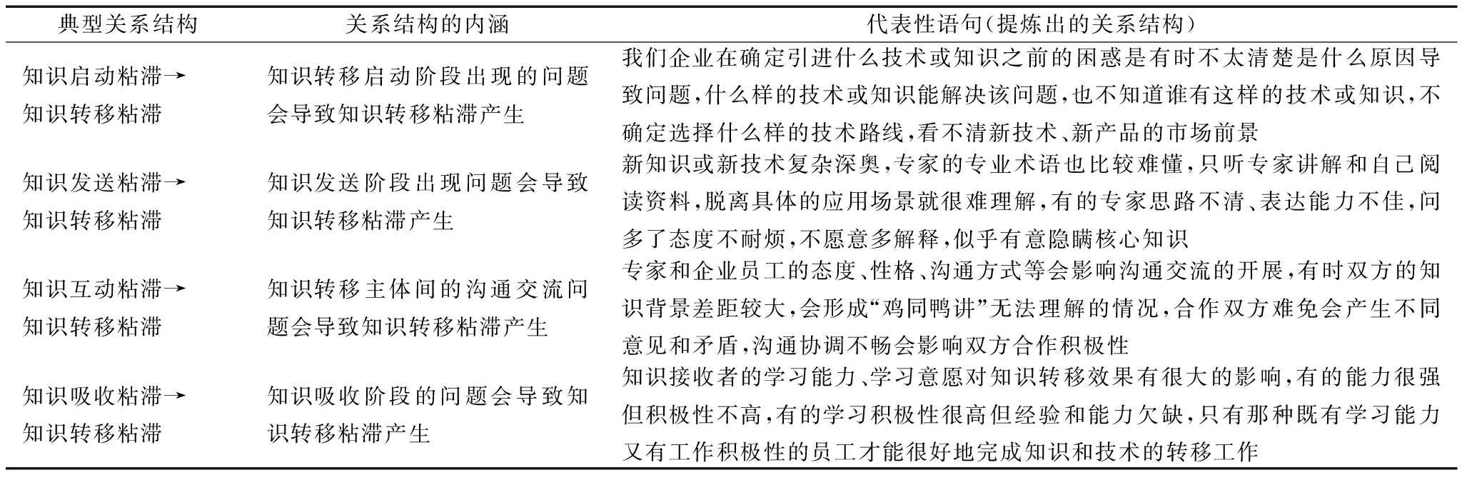 典型关系结构关系结构的内涵代表性语句(提炼出的关系结构)知识启动粘滞→知识转移粘滞知识转移启动阶段出现的问题会导致知识转移粘滞产生我们企业在确定引进什么技术或知识之前的困惑是有时不太清楚是什么原因导致问题,什么样的技术或知识能解决该问题,也不知道谁有这样的技术或知识,不确定选择什么样的技术路线,看不清新技术、新产品的市场前景知识发送粘滞→知识转移粘滞知识发送阶段出现问题会导致知识转移粘滞产生新知识或新技术复杂深奥,专家的专业术语也比较难懂,只听专家讲解和自己阅读资料,脱离具体的应用场景就很难理解,有的专家思路不清、表达能力不佳,问多了态度不耐烦,不愿意多解释,似乎有意隐瞒核心知识知识互动粘滞→知识转移粘滞知识转移主体间的沟通交流问题会导致知识转移粘滞产生专家和企业员工的态度、性格、沟通方式等会影响沟通交流的开展,有时双方的知识背景差距较大,会形成“鸡同鸭讲”无法理解的情况,合作双方难免会产生不同意见和矛盾,沟通协调不畅会影响双方合作积极性知识吸收粘滞→知识转移粘滞知识吸收阶段的问题会导致知识转移粘滞产生知识接收者的学习能力、学习意愿对知识转移效果有很大的影响,有的能力很强但积极性不高,有的学习积极性很高但经验和能力欠缺,只有那种既有学习能力又有工作积极性的员工才能很好地完成知识和技术的转移工作