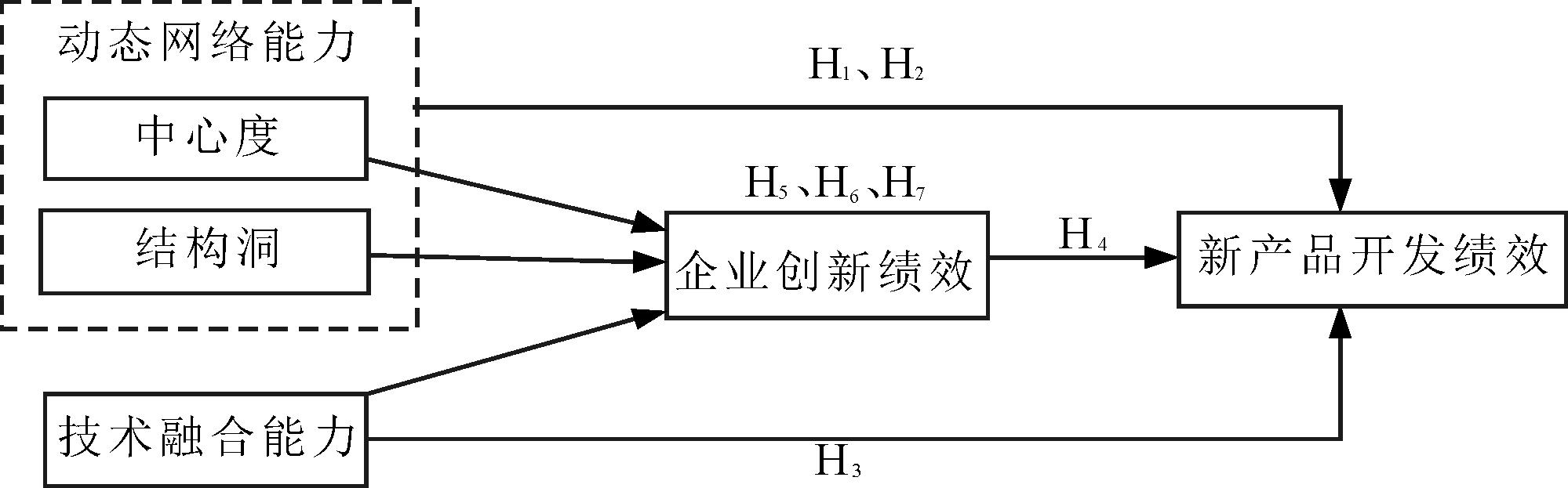 本文旨在探究企业动态网络能力、技术融合能力对新产品开发绩效的作用机理,揭示创新绩效在其中的中介作用,因而构建理论研究框架如图1所示。