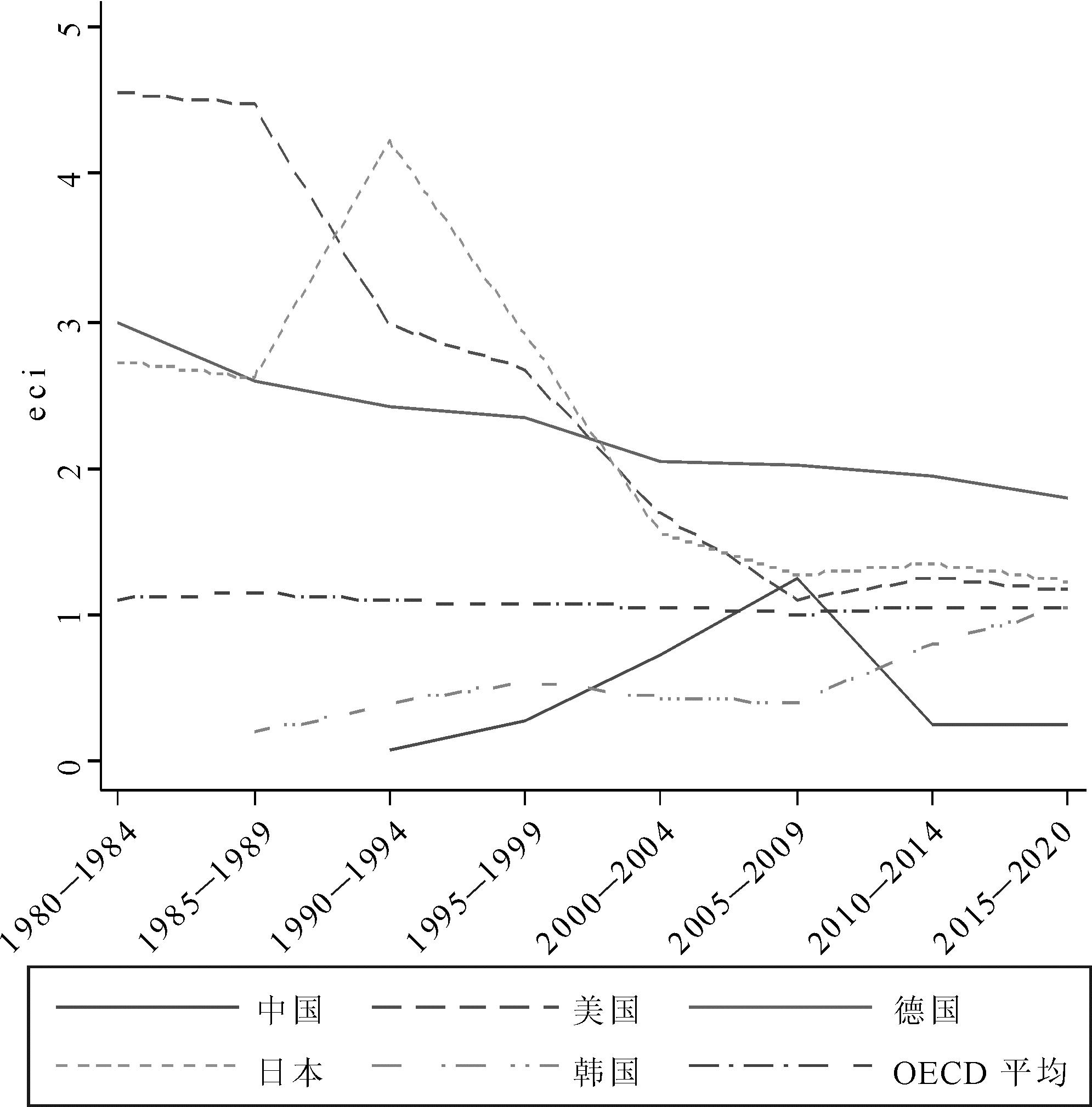 图2展示了各经济体创新基础能力指数变动趋势。数据显示,自20世纪80年代以来,德国创新基础能力指数总体保持平稳态势且目前最高(明显高于OECD平均水平),其它经济体逐步趋同于OECD平均水平,总体呈现“一强多同”的格局。其中,美国创新基础能力总体呈现下降趋势。日本在20世纪90年代中期以前总体呈上升趋势,但之后逐步下降。中国、韩国总体呈上升态势,中国在21世纪初呈现先上升又下降的阶段性走势,2014年之后进入低速平稳增长通道,这主要得益于在专利申请数、技术频谱宽度方面积累的优势;韩国出现下降又上升的阶段性走势。总体而言,OECD国家创新基础能力指数平稳增长,我国已赶上OECD平均水平并略高于美日韩但明显低于德国。