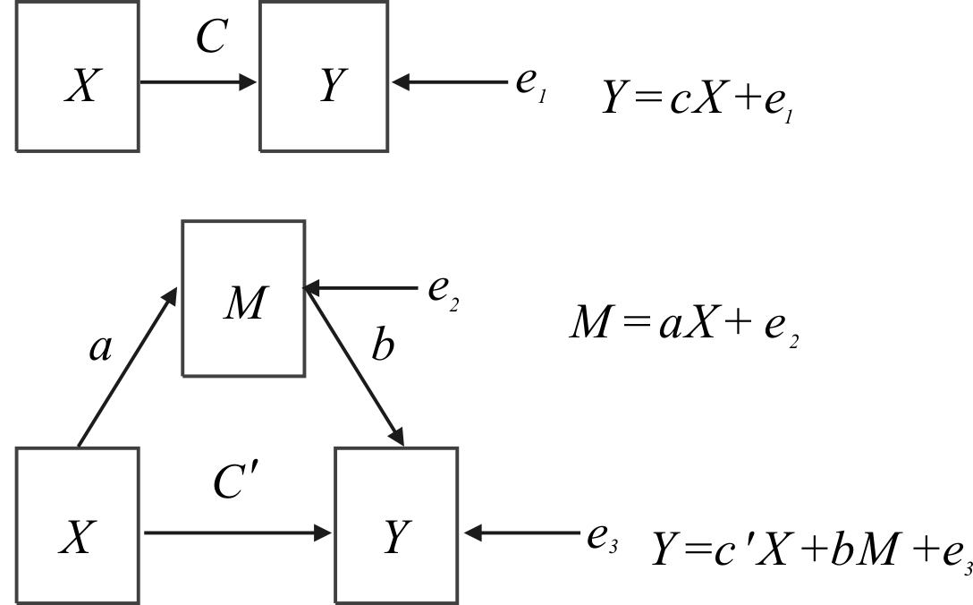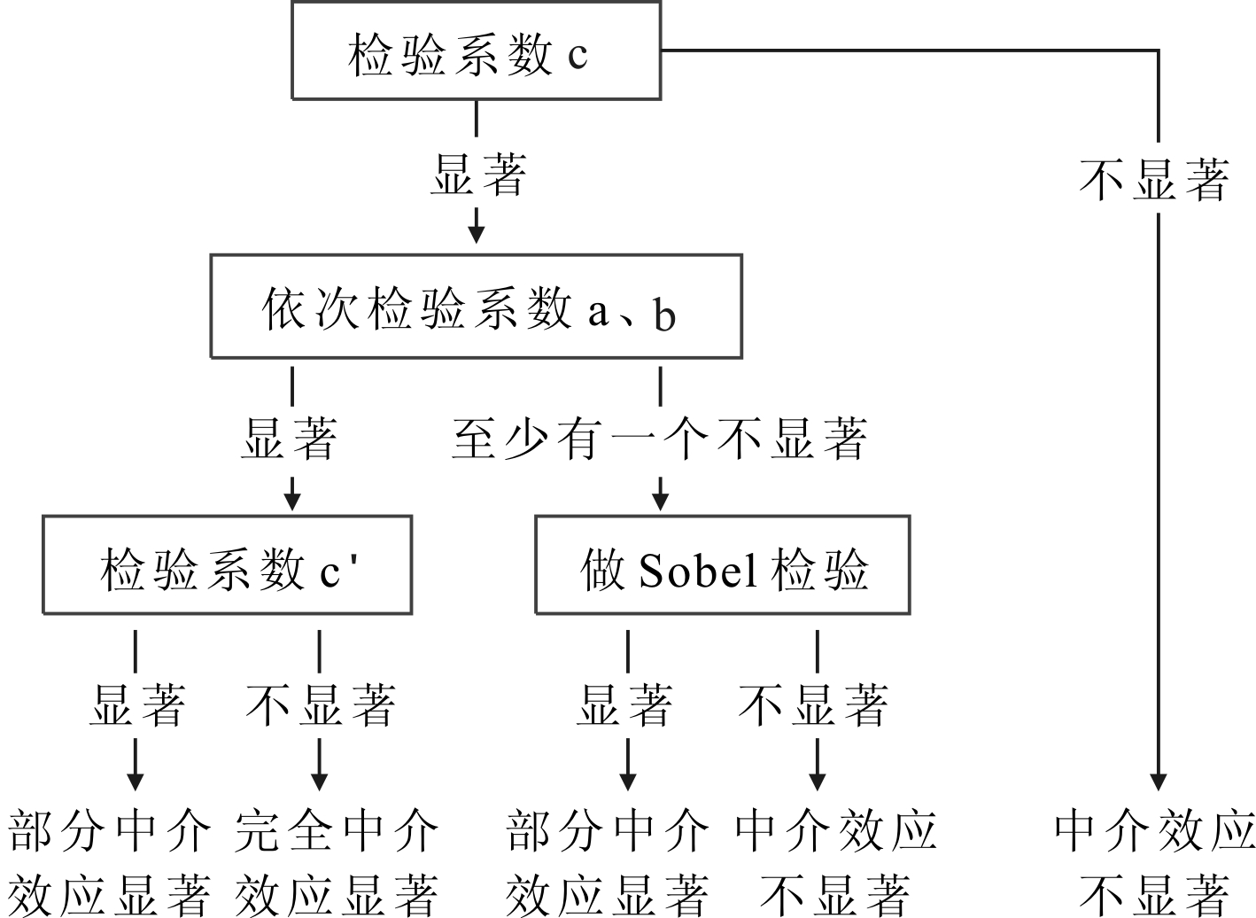 其中,图2中M为X(解释变量)与Y(因变量)之间的中介变量,c表示X对Y的总影响,a表示X对M的影响,b表示M对Y的影响,c'表示经过M后X对Y的直接影响,c-c'(=a*b)为经过M后X对Y的间接影响。Sobel检验主要是检验ab乘积项的系数是否显著,检验统计量为