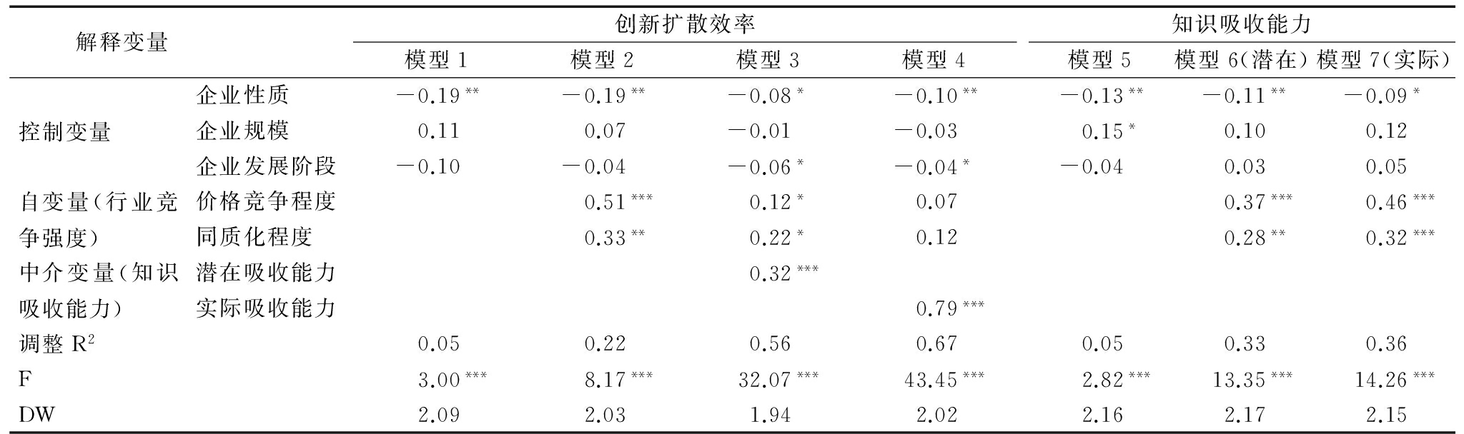 各变量均值、标准差、相关系数如表2所示。从表2可以看出,价格竞争程度、同质化程度与创新扩散效率正相关;知识吸收能力各维度与创新扩散效率正相关;价格竞争程度、同质化程度分别与知识吸收能力的4个维度正相关,这与前期研究假设相符。