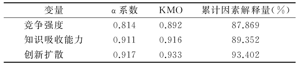 变量α系数KMO累计因素解释量(%)竞争强度 0.8140.89287.869知识吸收能力0.9110.91689.352创新扩散 0.9170.93393.402