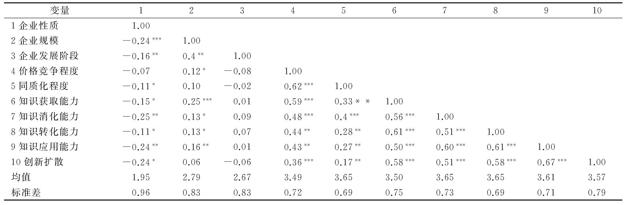 变量123456789101企业性质1.002企业规模-0.24***1.003企业发展阶段-0.16**0.4**1.004价格竞争程度-0.070.12*-0.081.005同质化程度-0.11*0.10-0.020.62***1.006知识获取能力-0.15*0.25***0.010.59***0.33**1.007知识消化能力-0.25**0.13*0.090.48***0.4***0.56***1.008知识转化能力-0.11*0.13*0.070.44**0.28**0.61***0.51***1.009知识应用能力-0.24**0.16**0.010.43**0.27**0.50***0.60***0.61***1.0010创新扩散-0.24*0.06-0.060.36***0.17**0.58***0.51***0.58***0.67***1.00均值1.952.792.673.493.653.503.653.653.613.57标准差0.960.830.830.720.690.750.730.690.710.79