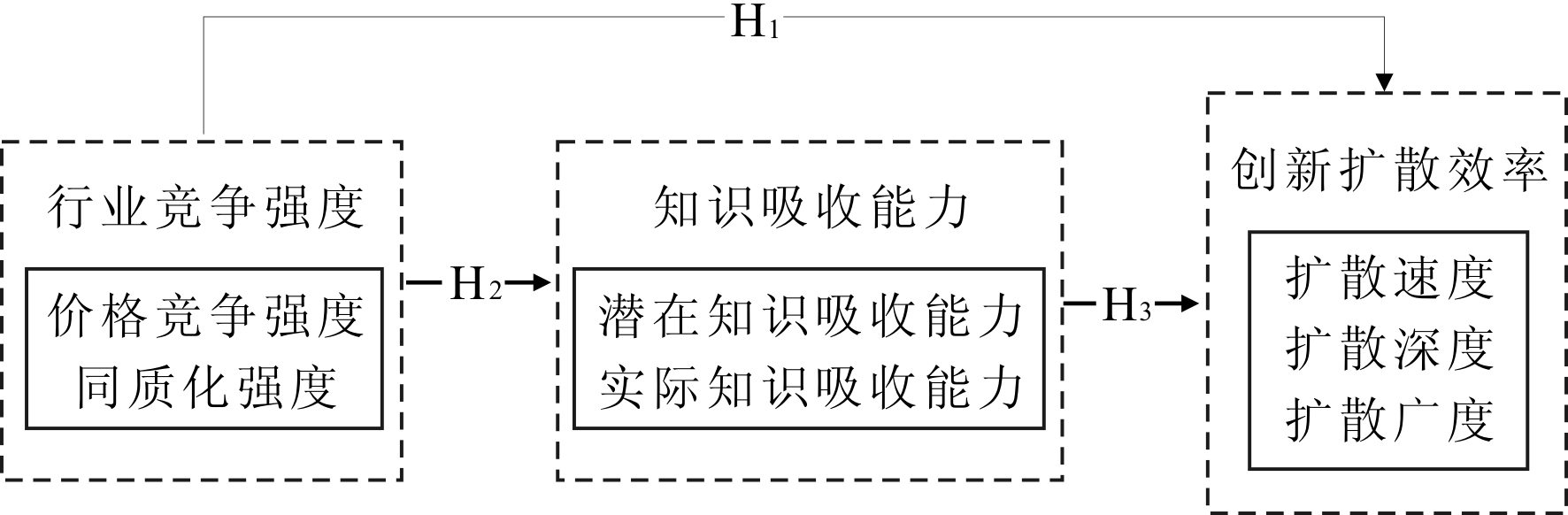 综上所述,本文构建了行业竞争强度、知识吸收能力与创新扩散效率三者之间关系的概念模型,如图1所示。
